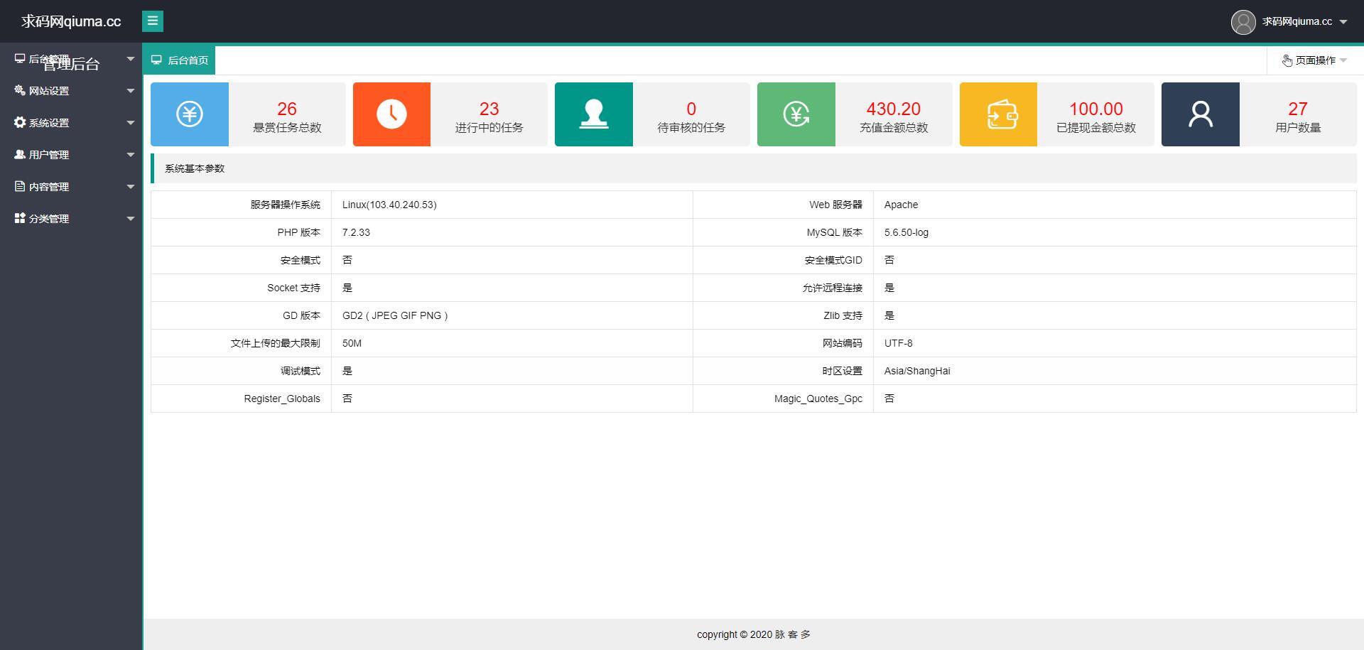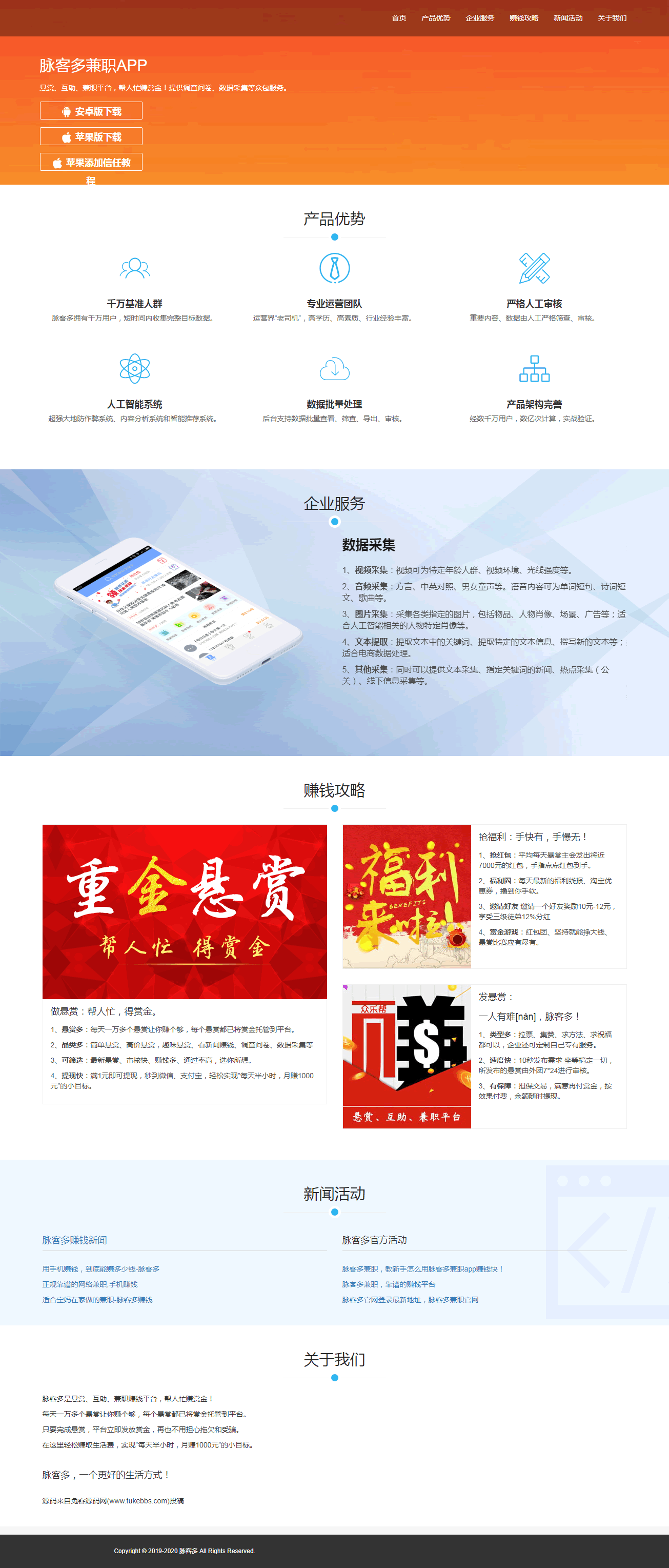 附送精美APP下载页,看上去绝对高端上档次。安装教程在文件包里。 悬赏任务兼职系统,仿蚂蚁帮扶众人帮平台,功能齐全,包含接任务,发布任务 店铺关注,置顶推荐,排行榜,新人福利,红包大厅,红包抽奖,任务步骤 微信绑定,分销推广,举报维权,vip会员特权等众多功能,已有客户上线运营,支持微信绑定登陆。带APP推广页