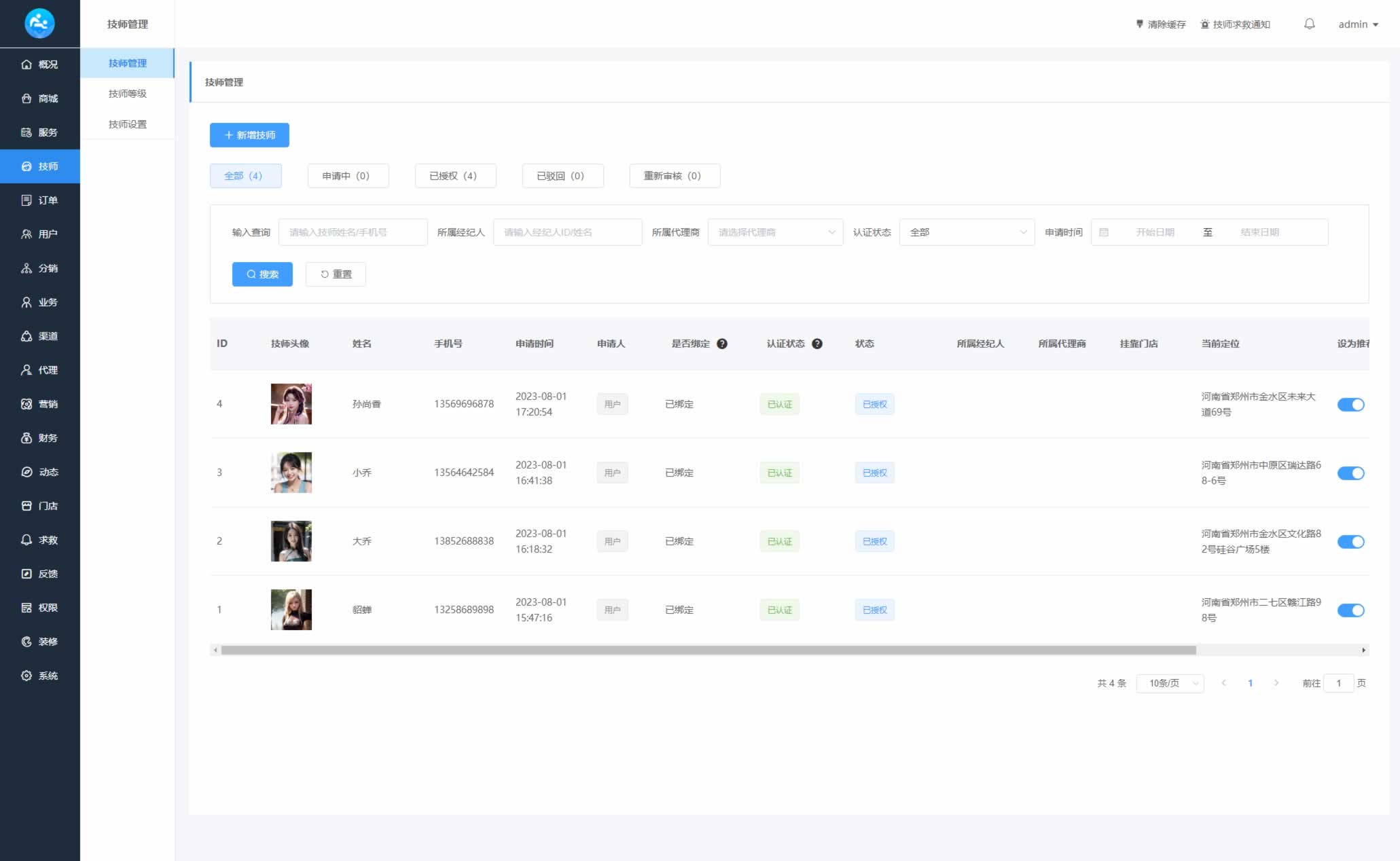 27、后台新增:技师统计(技师概况、技师数据统计、区域分布、技师数据等,可视化数据一目了然)