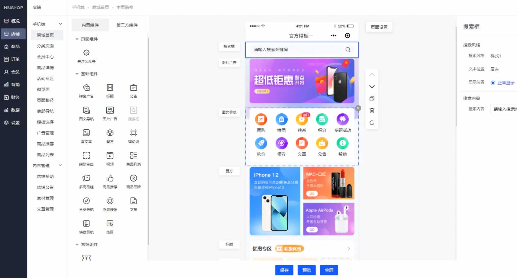 后台可以自由拖曳修改前端UI页面 还支持虚拟商品自动发货等功能 挺不错的一套源码