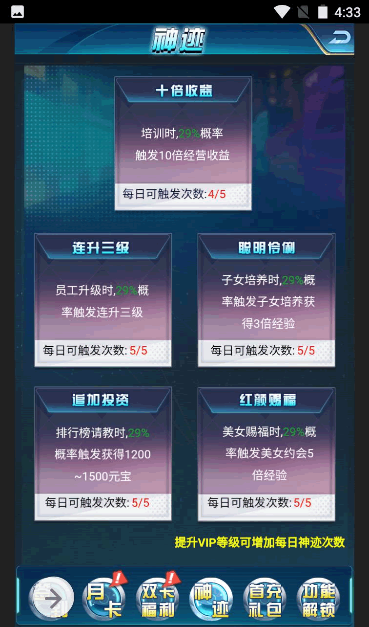 该游戏是吸收更多现代商业经营精髓,展开一场充满乐趣、全方位、高度真实的创业、商战演习。游戏中,玩家投身全民商战的狂潮,白手起家,开店铺、建工厂、修建筑、资本运作,合理规划,建立起生产、销售一体的实业王国,成为玩转资本市场的世界名流。叱咤风云的富豪传奇,不管你是喜欢简单的傻白甜,还是喜欢烧脑的智多星,都能在简单轻松的游戏氛围中创造出属于你的财富故事!