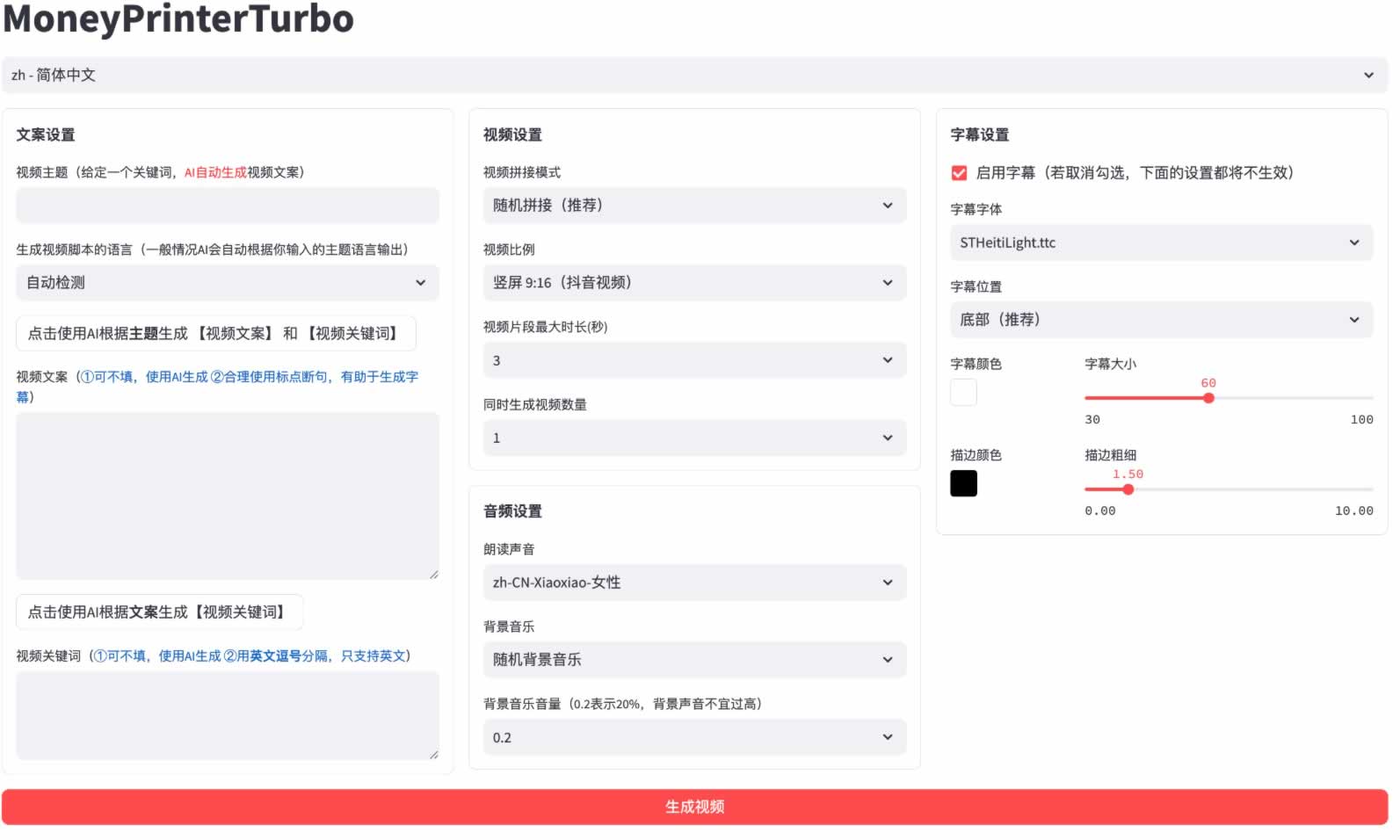 只需提供一个视频 主题 或 关键词 ,就可以全自动生成视频文案、视频素材、视频字幕、视频背景音乐,然后合成一个高清的短视频。