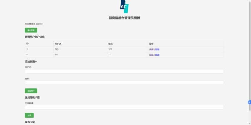 功能1:带管理员后台,可管理前端用户新增、编辑、删除等,自带卡密系统,后台可生成卡密,用于前端用户注册