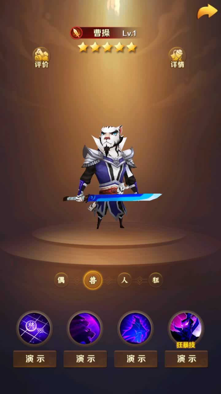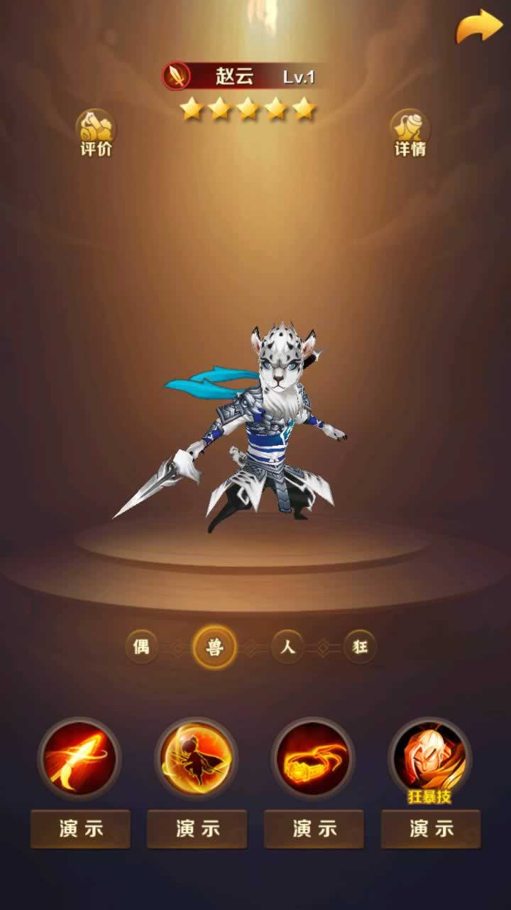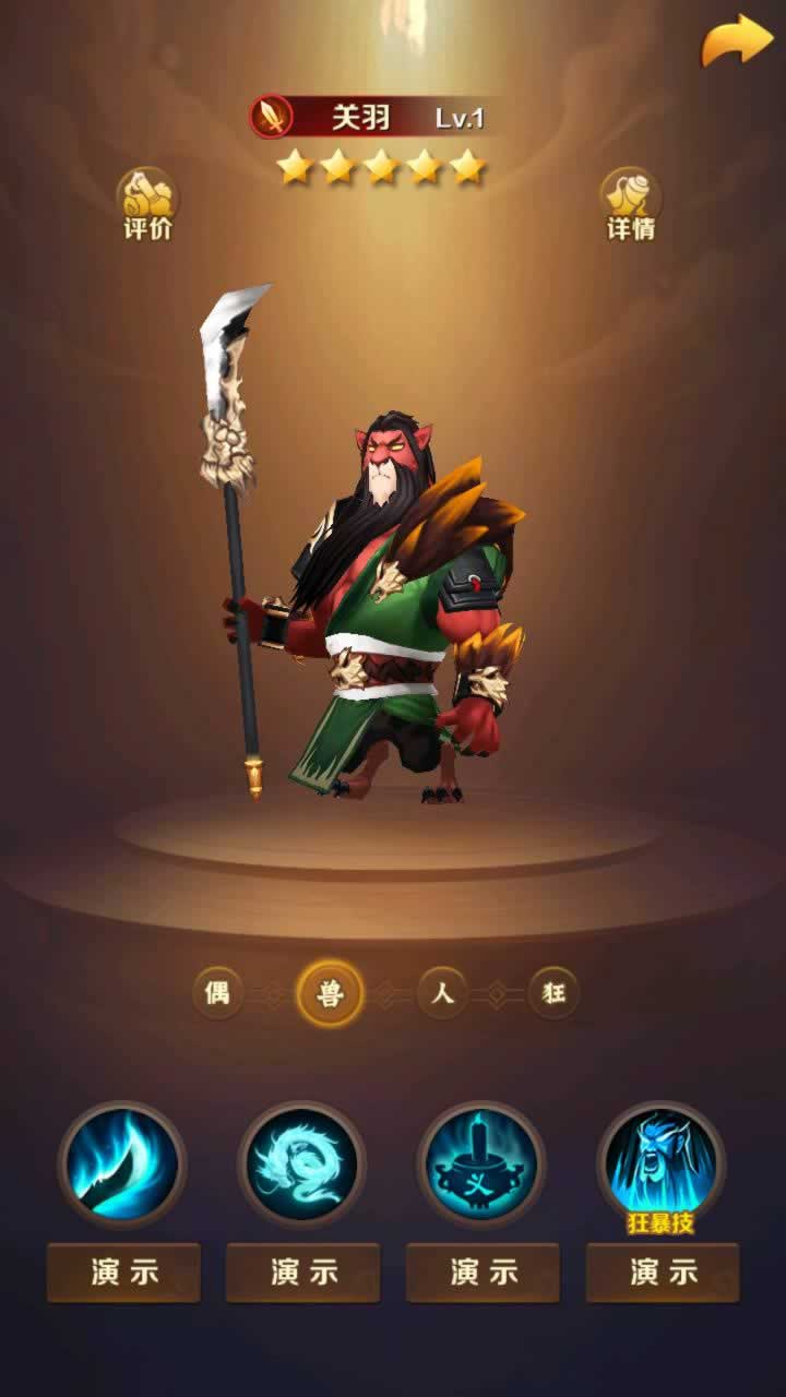 这是一款回合制策略手游。游戏讲述了魔帝徐福试图控制三国世界,三国名将全部被兽化成为野兽。玩家需要在游戏中不断收集各路名将,帮助被兽化的三国名将恢复人形对抗魔帝,培养组合属于自己的最强军团来应对各种战斗。