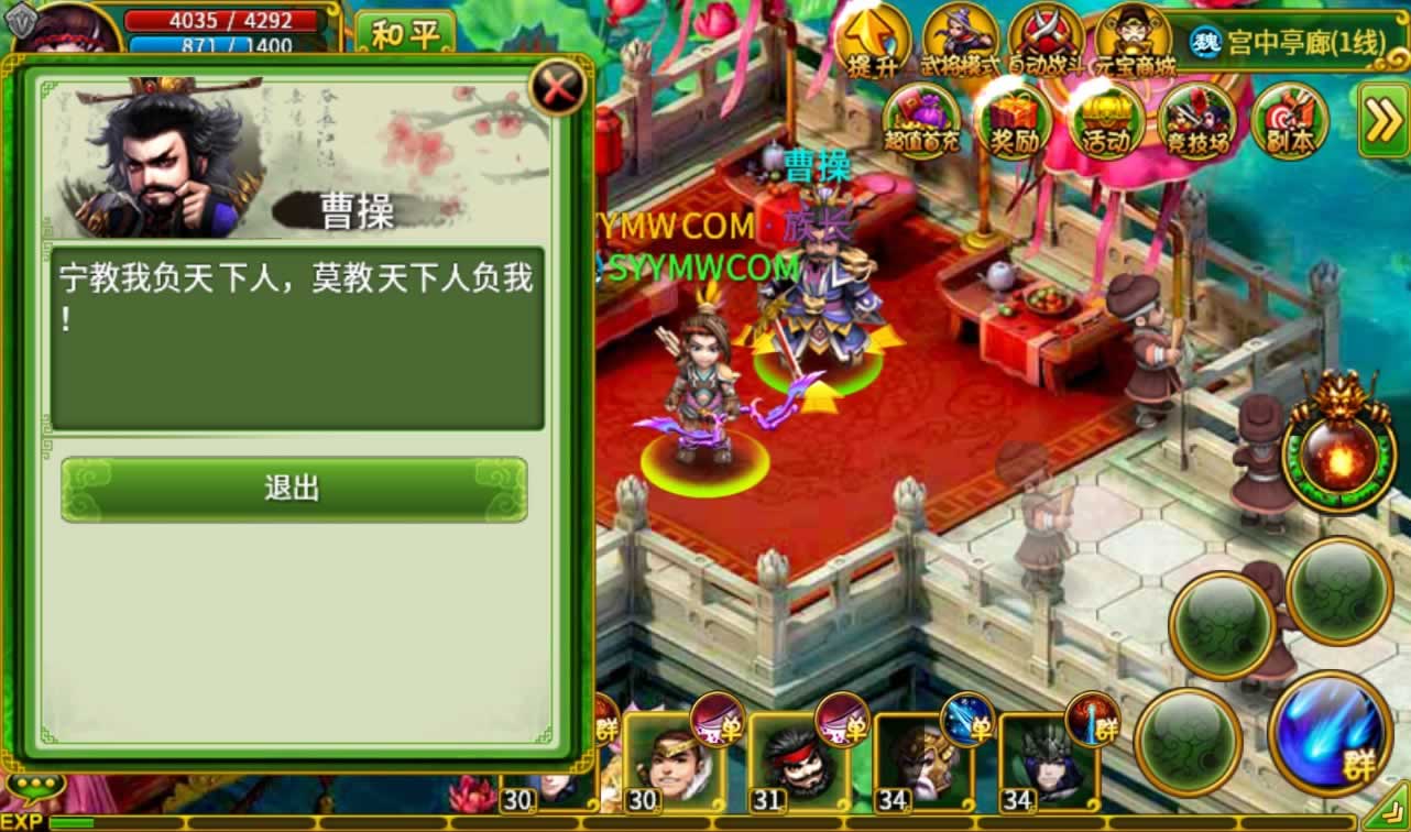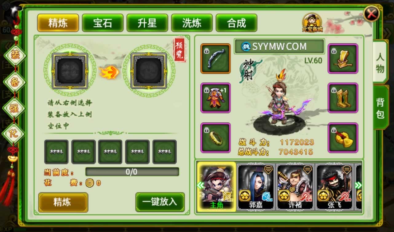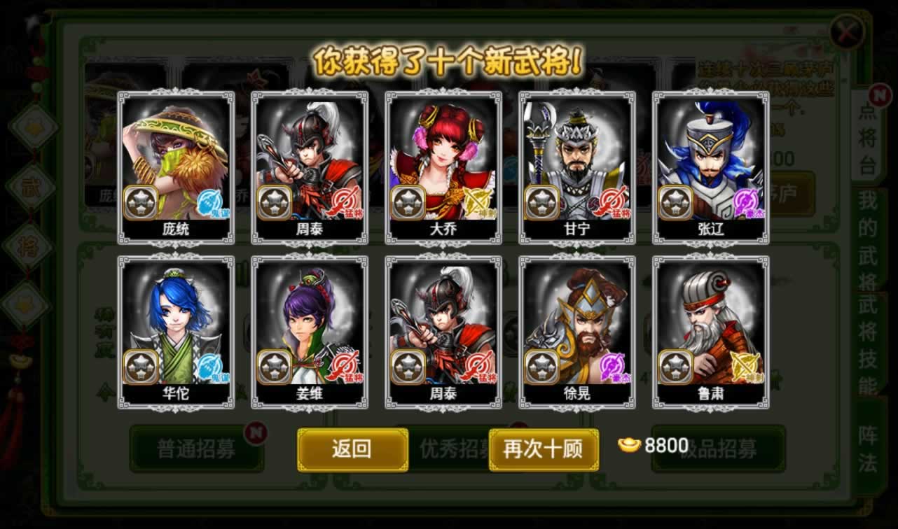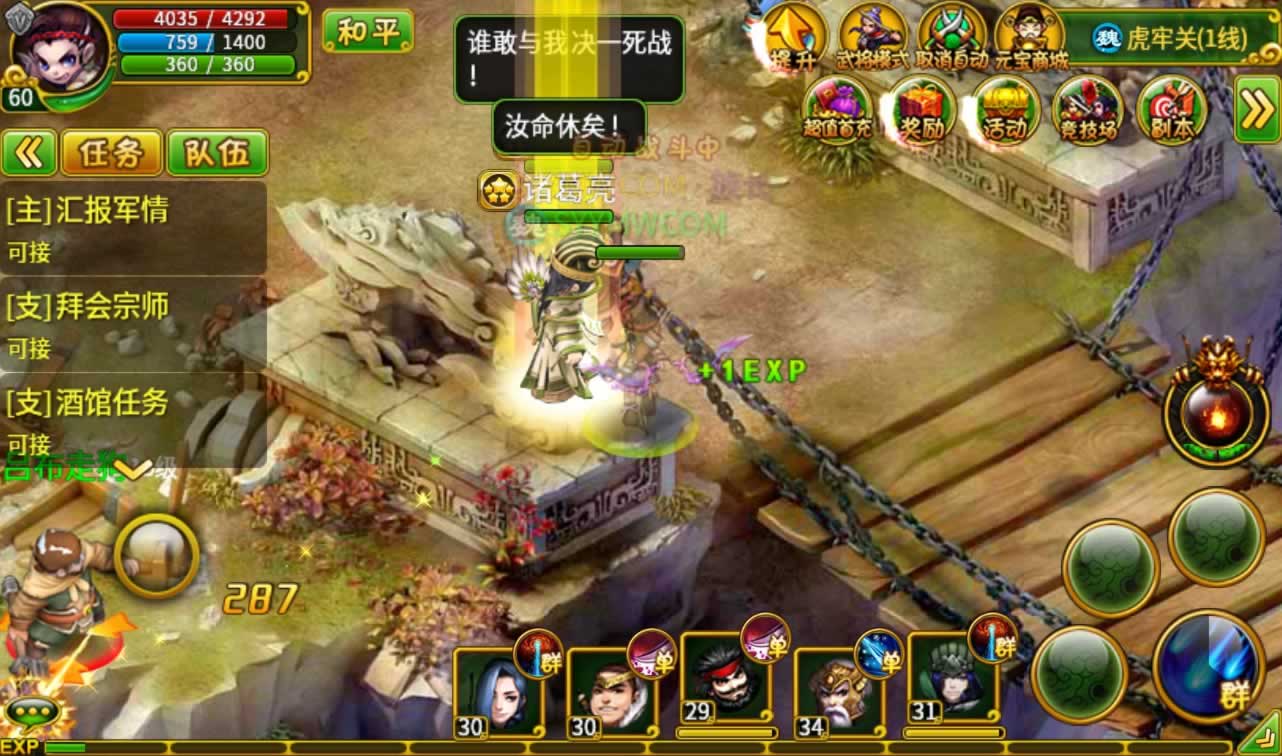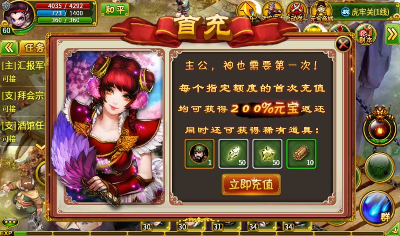 该游戏采用即时战斗模式,通过做任务、刷副本的方式获取经验、道具。玩家需要通过刷副本获得更高等级、更高品质的装备,然后需要通过精炼、升星、宝石镶嵌、洗炼等方式强化自己的装备。通过武将招募系统,玩家可以招募到三国时期的著名谋臣武将,组成自己的武将队伍,一同与敌人战斗。 聊天、邮件、组队、家族等强大的交互系统让你在成长路上永不孤单,还有寄售行、交易邮件等系统帮你采购心仪的宝贝、或赚取丰厚的财富。 游戏后期将开启帮派、国家管理等系统,你是否已经看到自己登上皇位君临天下的绝美画面?是否已经听到了帮派战、国战中充满激情的嘶吼?