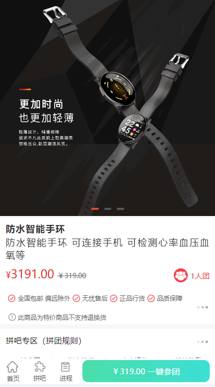 2拼团模式:从商品区选择产品进行拼团,拼团中了和不中都会给与相关的奖励,可以是积分可以是红包。根据用户需求自行设定