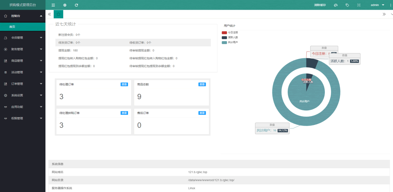 4,活动管理,主要就是拼团模块!添加拼团活动,产品从商品管理添加的产品里筛选,然后进行拼团设置!