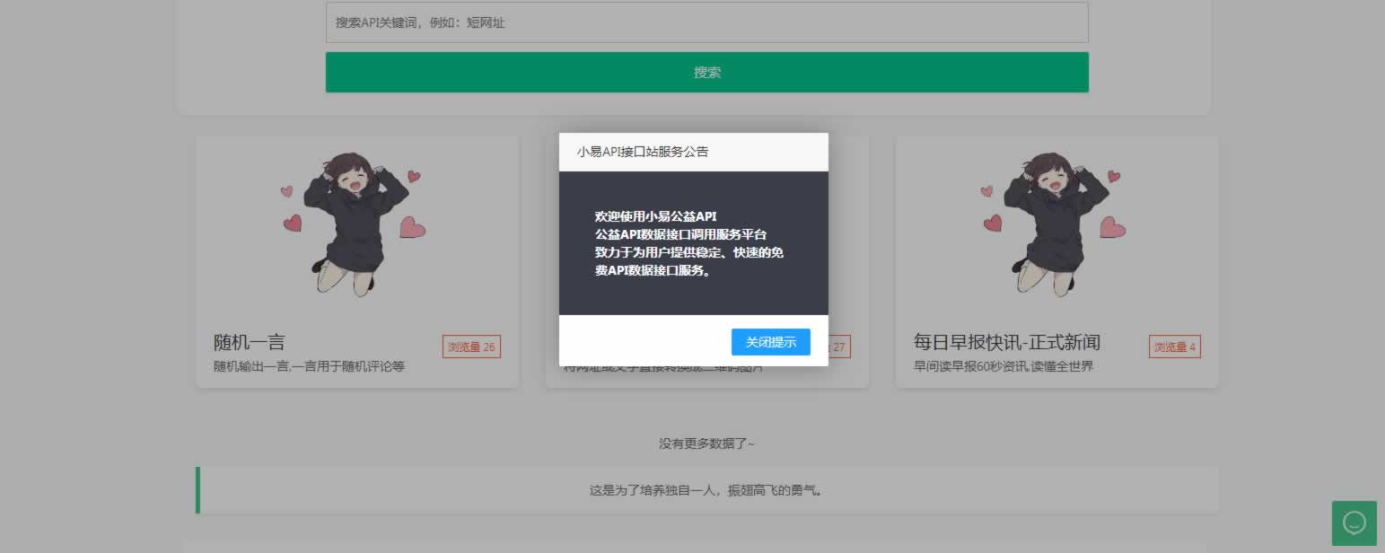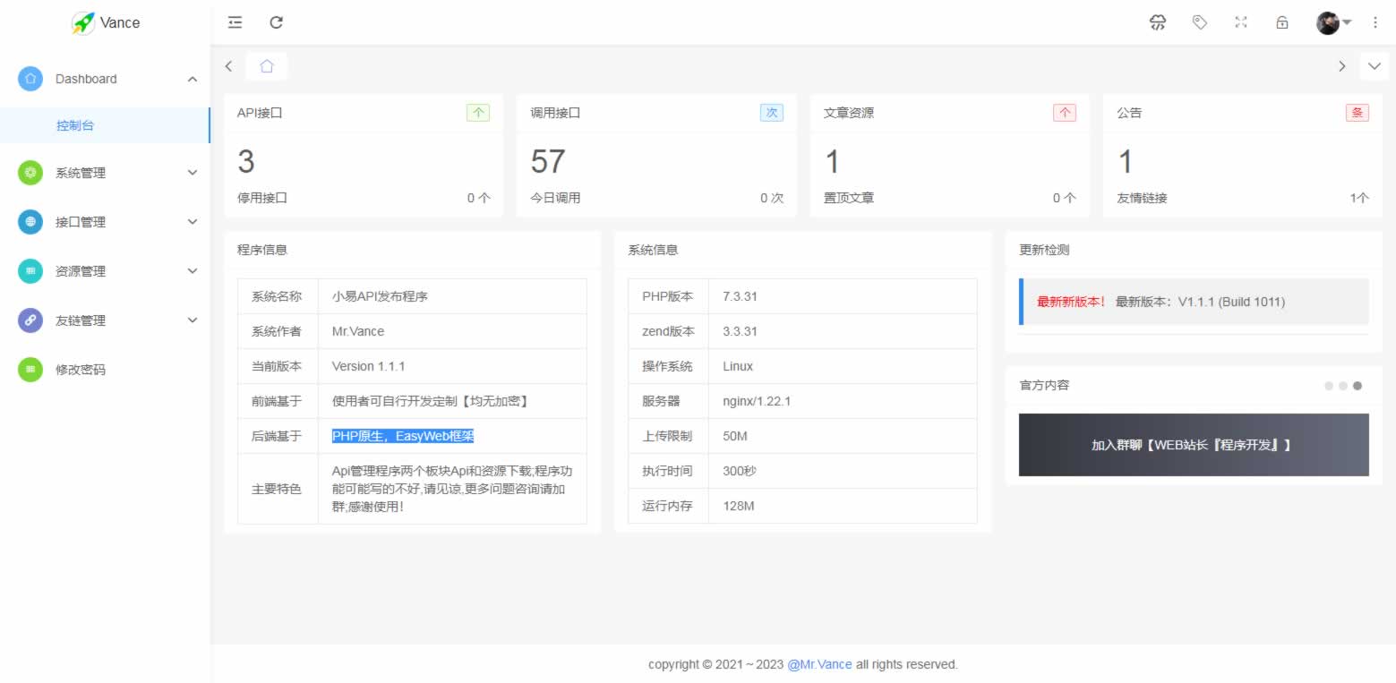 本系统为API系统,实现了api集成等基础功能,以后可能会更新key调用api,或者实现付费功能,敬请期待,前端模板均无加密,用户可自行二开,具体请看图