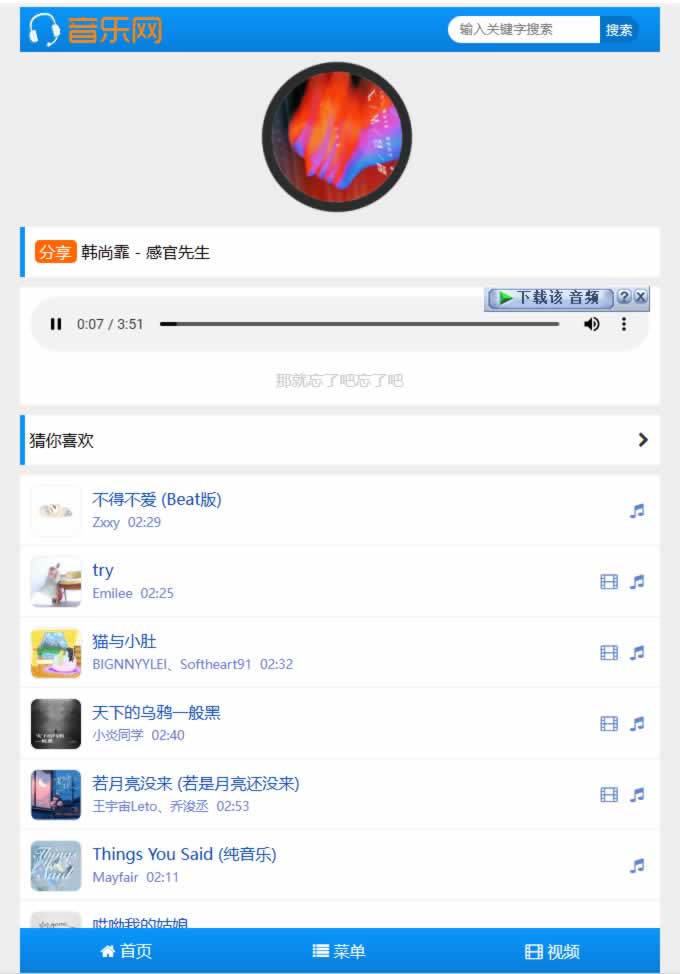 调用音乐API,将返回的信息进行解析,实现在线播放以及视频音频外链地址获取。