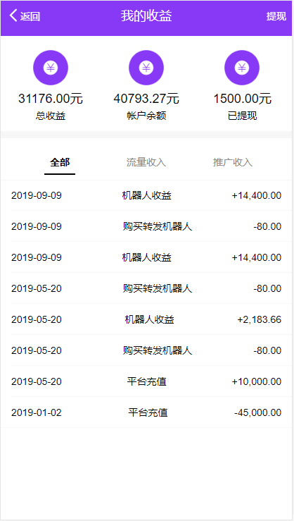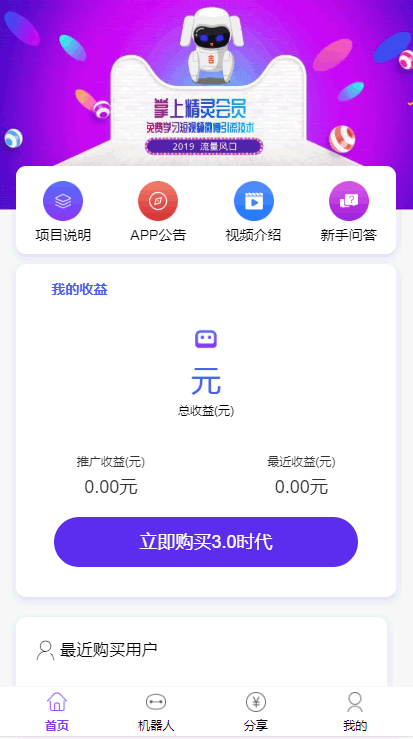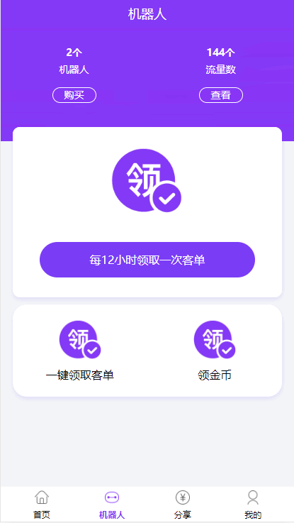 购买机器人点击流量,每天可获得相应收益,分享成功购买机器人可获得动态收益