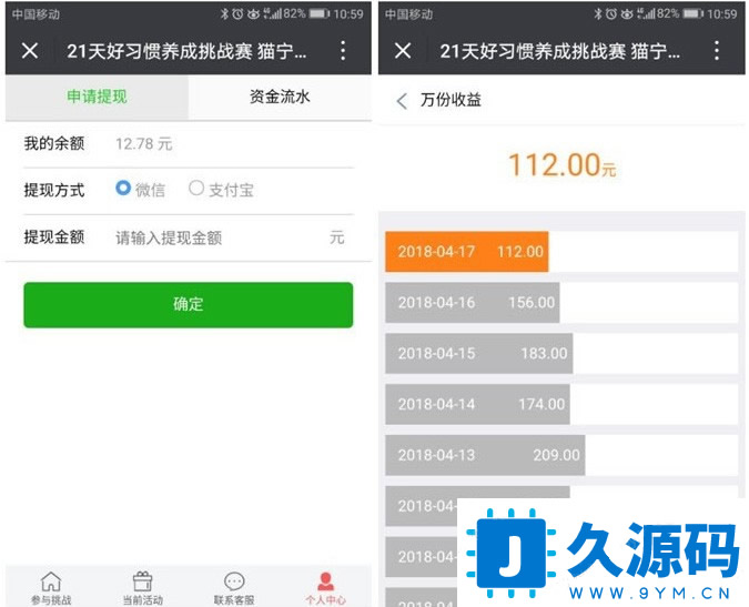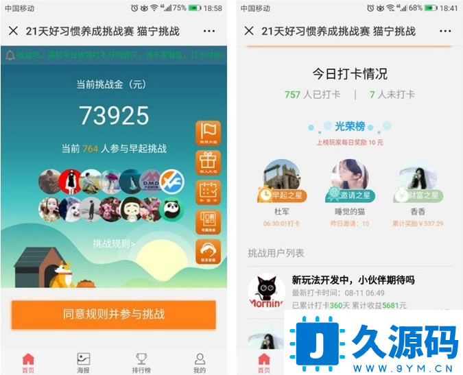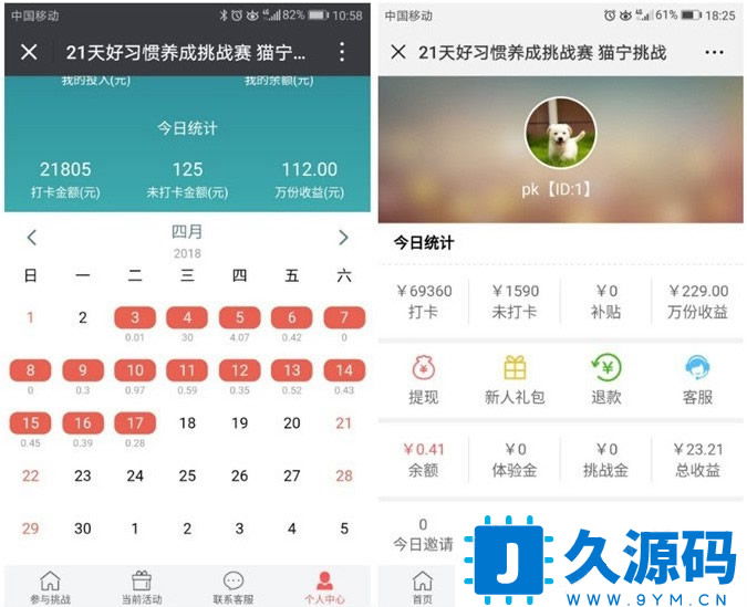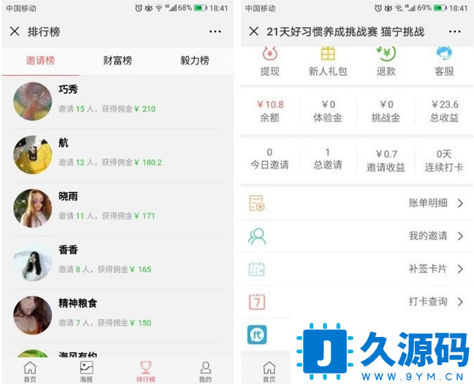 新版Thinkphp独立打卡赚钱系统源码公众号+手机wap登录注册双版本,TP内核每天打卡签到赚钱理财朋友圈营销源码,参加者打卡挑战者支付挑战金,连续打卡签到21天可退还挑战金,打卡挑战者按照1元每份额每天瓜分未打卡挑战者挑战金,支付挑战金越高,瓜分奖励金也就越高。