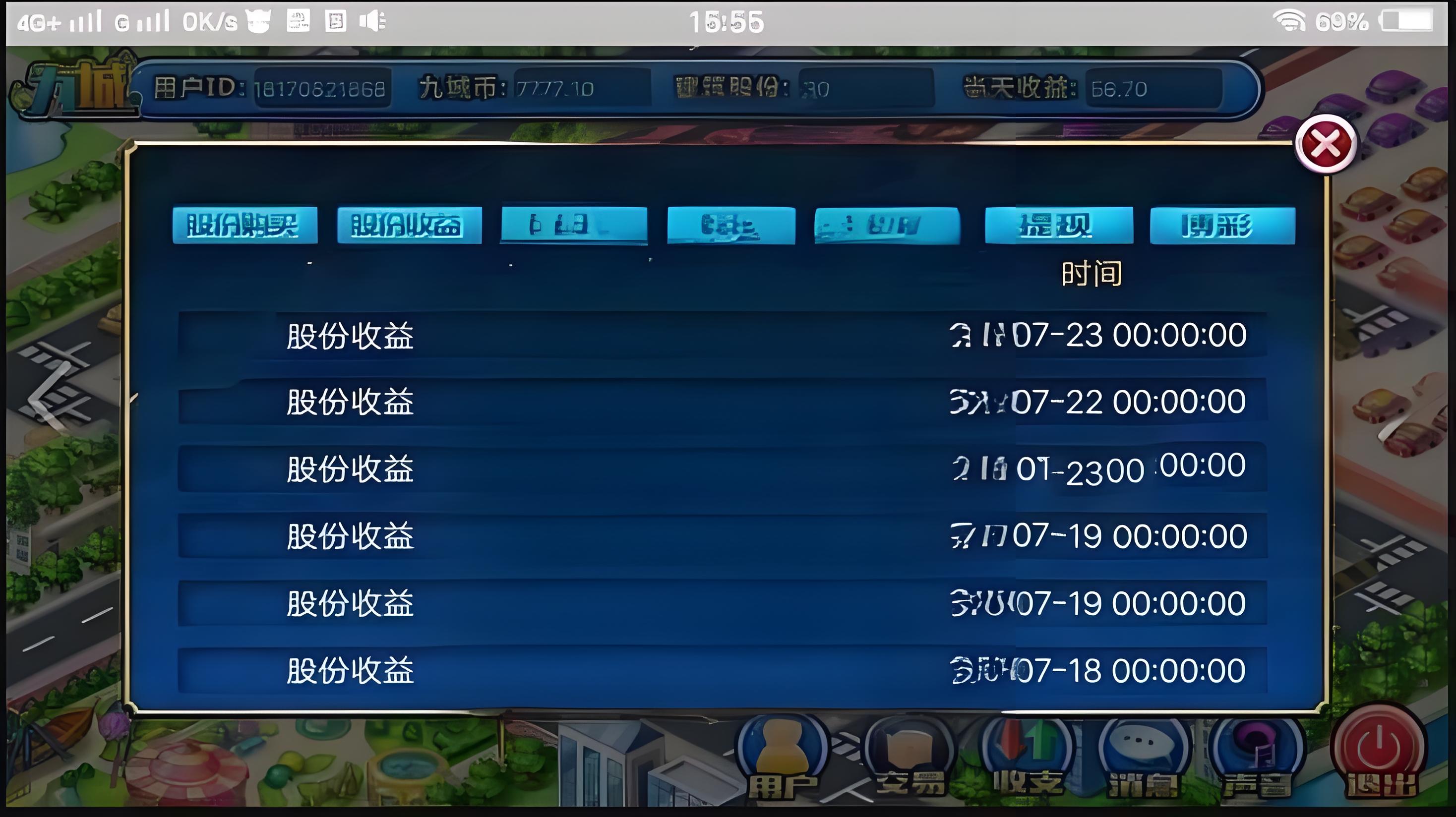 2、股份说明:五栋经营建筑固定持股为100九城币/股,每日拆分1.0%~4%,股份收益至200九城币截止,需重新办理持股手续才能继续享受红利收益,反之,下级玩家每增加一股持有股份,上级玩家都可得到相应的拆分奖励。新玩家需缴纳30九城币开设账户。最低100九城币就可入股游乐场。