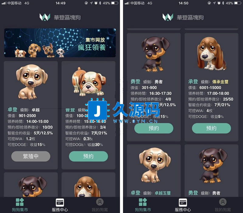 非常火的华登区块狗源码,目前华登区块狗已经运营二年多了,很多人在上面赚翻了 我身边都有不少人玩这个,一个月轻松月入1万多。我也是最近才开始玩这个 但小编实在是胆子小,不敢投入太多了,每次抢狗都慢人一拍。目前就一条狗,收入也就几百块钱。 华登区块狗据说是一个香港珠宝商搞的,今天居然发现了这个源码 于是果断拿下分享出来,至于是不是目前市面上运营的华登区块狗原版源码 这个无从得知,毕竟谁也没见过原版源码,但至少该有的功能都有了,感兴趣的下载体验吧。 1、领养收益 区块狗有8个品种,每天抢到以后可以享有领养佣金,日1%-5%。这个收益不是每个人都有,关键靠抢。 2、推荐收益 这么好的项目分享给伙伴,一级推广奖励8%、二级3%、三级5%,也仅有三级。 例如:你有100人直推团队,每人每天领养5000元总价值的区块宠物狗 因而团队收益是5000*3%*100=15000元,而你的推荐奖励是:15000*8%=1200元/天!这仅仅是一级,二级和三级都还没算。 3、团队服务奖励 做市场的团队领导人,有责任给团队分享制度和华登高通集团的企业文化 因而也会有团队服务奖励给社群领导人,推广大使奖励1%,服务商奖励3%,合伙人奖励5%。不同级别的团队领导人,有不同的奖励标准! 4、微分奖励 推荐10人,奖励360微分 推荐15人,奖励500微分 推荐30人,奖励1000微分 注:每自然月统计,次月1日充值后3个工作日内发放微分 5、狗狗币奖励 区块狗是华登高通(资产)管理集团和世界出名的虚拟币 狗狗币,联合打造。因而每抢到一只狗狗,都可以挖到肯定数量的狗狗币DOGE 自从合作以来,狗狗币顺势大涨,已经翻了一倍! 6、挖矿WIA珠宝公链奖励 交易即挖矿,每预定并领养狗狗,都是在为WIA珠宝公链贡献价值 因而系统自动奖励WIA币做为回报,目前WIA价格已经是6港币/枚,上交易大盘以后估计有10倍回报。
