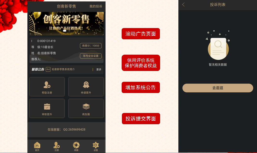 创客新零售系统超级合伙人推荐好友团队推广源码支持帮助注册 可随时查看团队直推合伙人人数和一星以上合伙人人数按等级排序,新创客13星申请晋级、批准审核源码。 系统自动按照注册顺序,推送商家名片给消费者也就是闯关者 闯几关就推送你直推人上面的第几个商家给你 只要对方的级别不低于你要闯的级别低就点对点进行匹配 找主管消费,系统把你直推人,背后离你最近的,达到主管级别的商家和你进行匹配。