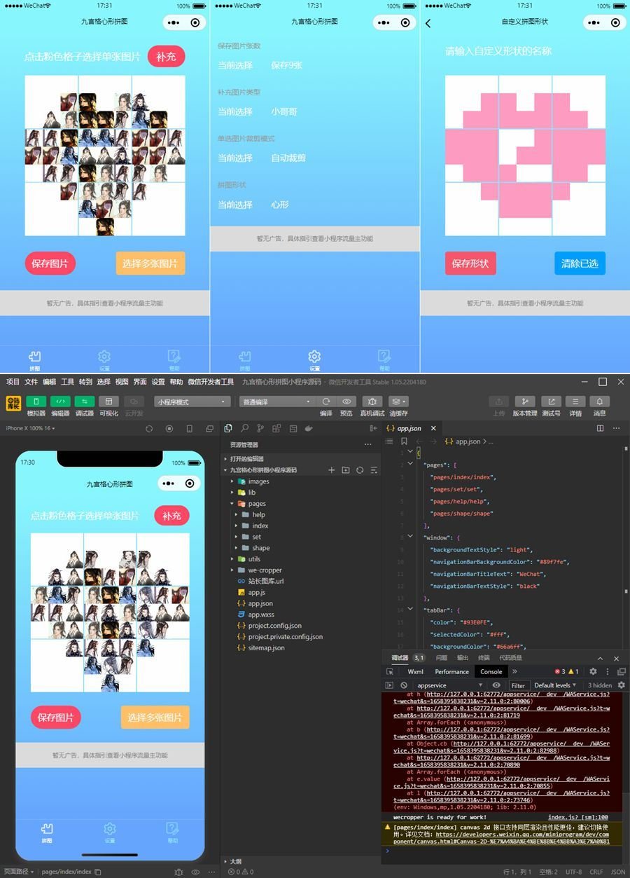 九宫格心形拼图小程序源码,带流量主微信小程序源码。可以自定义拼图形状,保存张数 自由填充图片、自由剪裁图片等。并带有流量主广告位,有需要的可以下载看看。