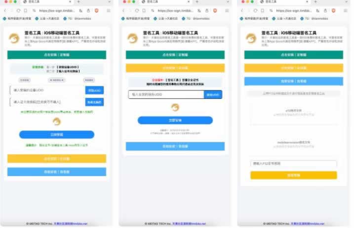 安装app的页面需要在后台添加应用时设置域名才能打开,如果此应用设置的域名是 ios-sign.timibbs.vip ,访问 ios-sign.timibbs.vip 就会打开此应用的安装页面,每个应用都是独立域名安装的
