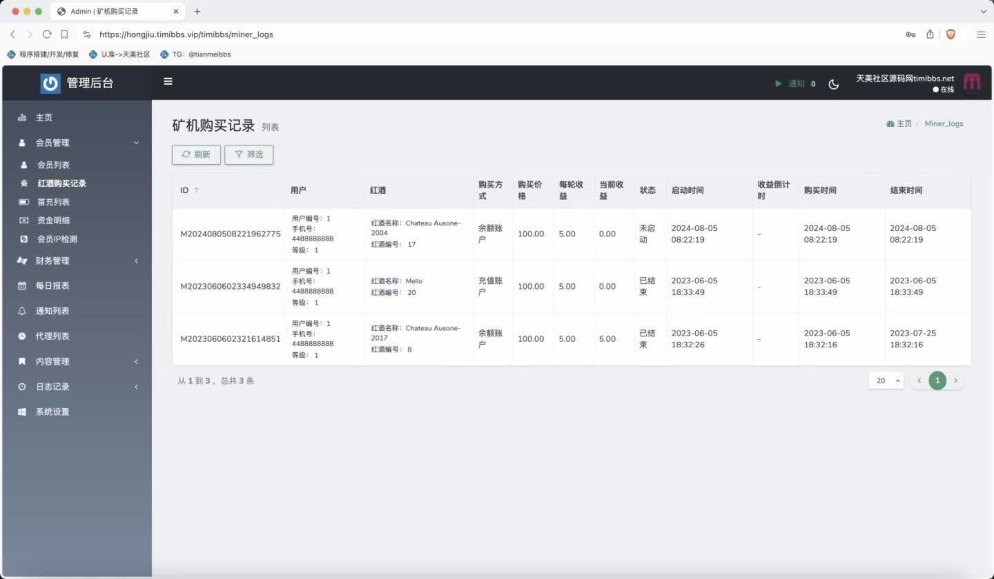 红酒投资理财盘,基于矿机理财程序二开的,上次打包出来的程序还有一些都没测试,正在慢慢清库存