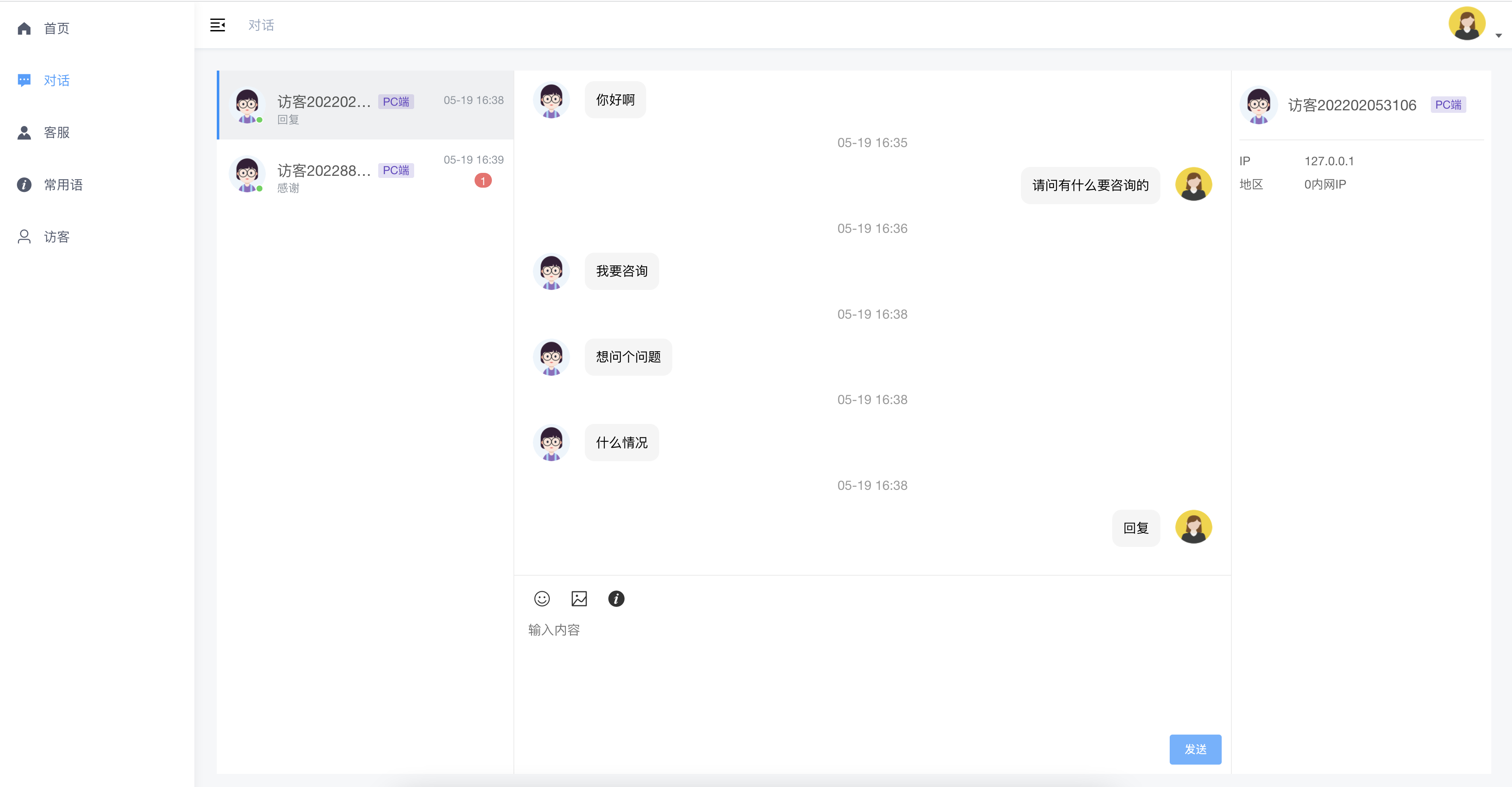 dingdong(叮咚客服)是一款在线的是实时的网页咨询系统,他类似于美洽、合从 等第三方网页客服系统,有力的帮助商城系统、 法务系统、聚合服务平台、教培系统等需要在线咨询的网站。同时还可以帮助更多的程序小白从此项目中汲取经验,应用在OA系统等需要沟通的内部系统中,了解websocket通信 从而提升自己的竞争力。