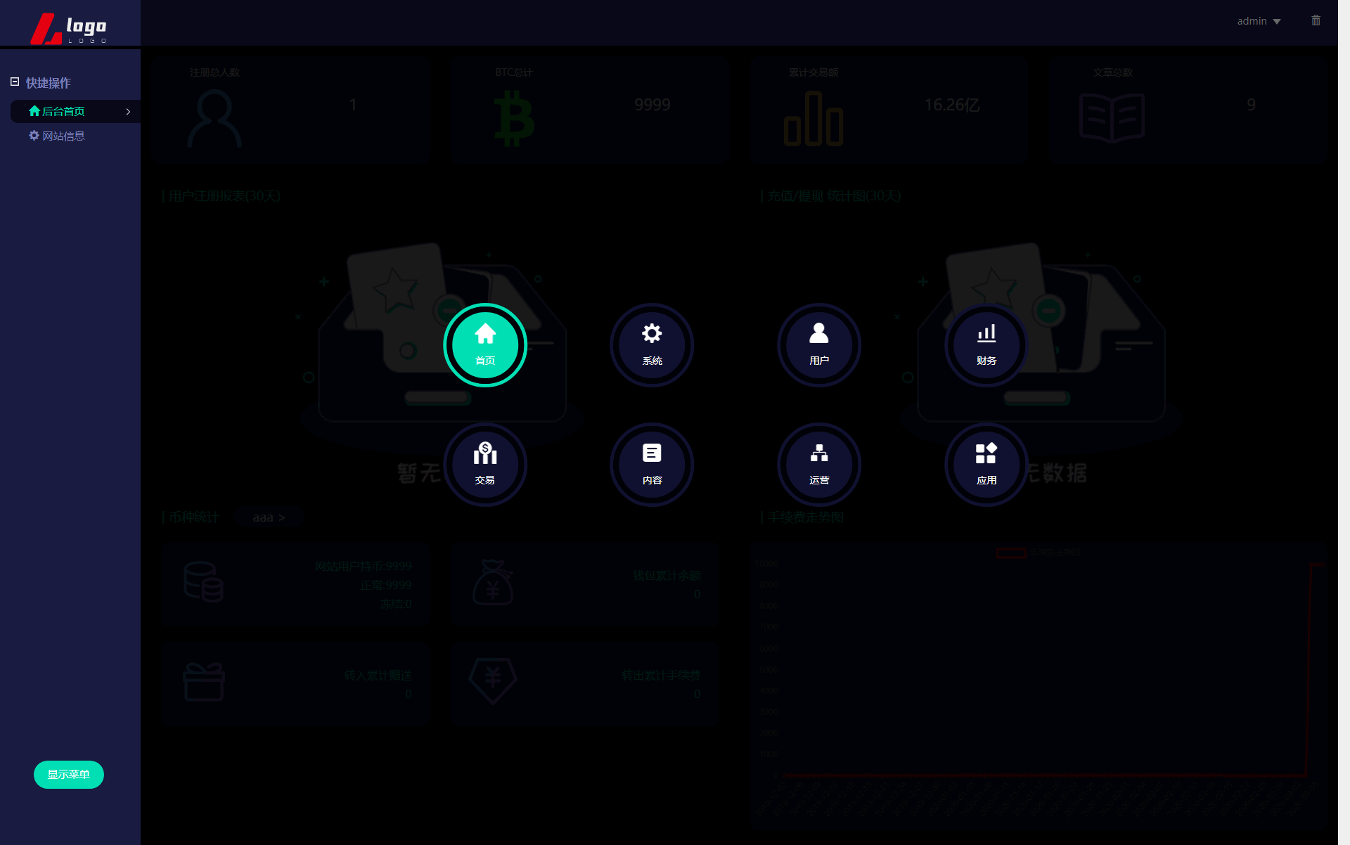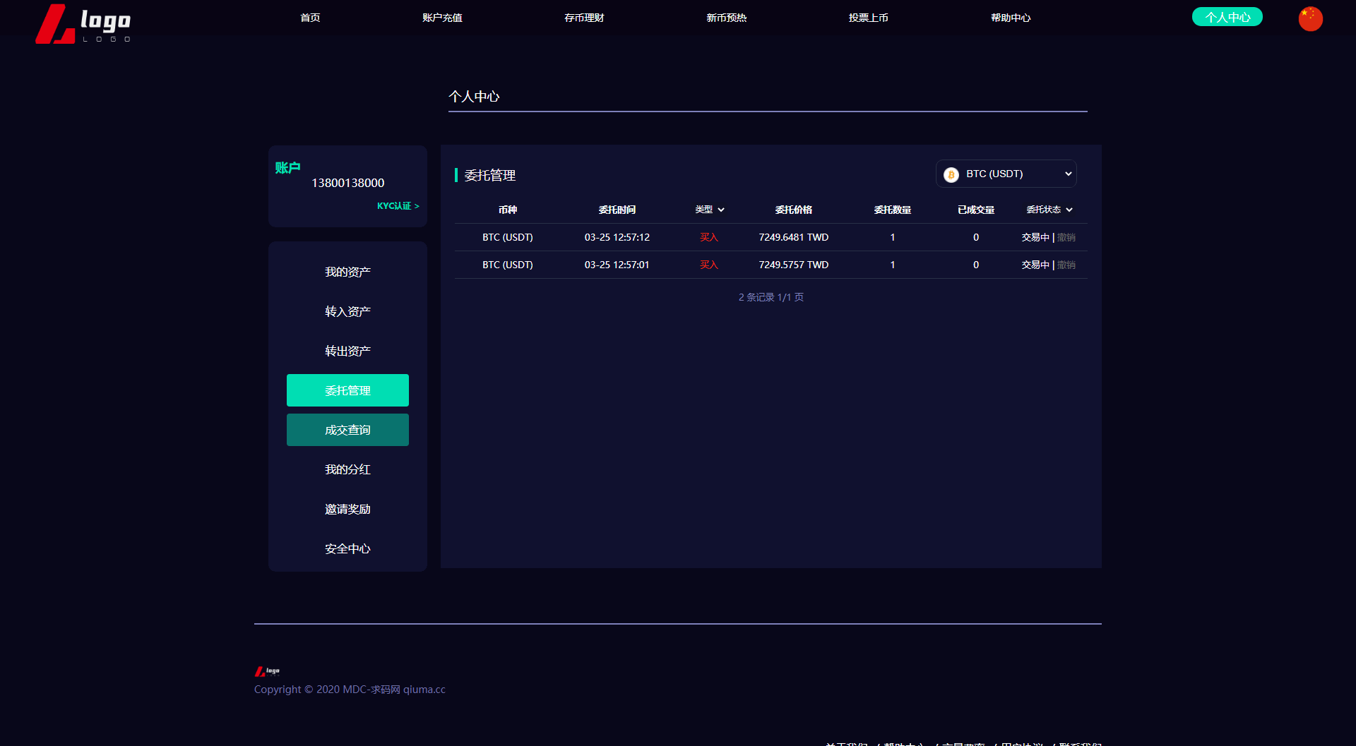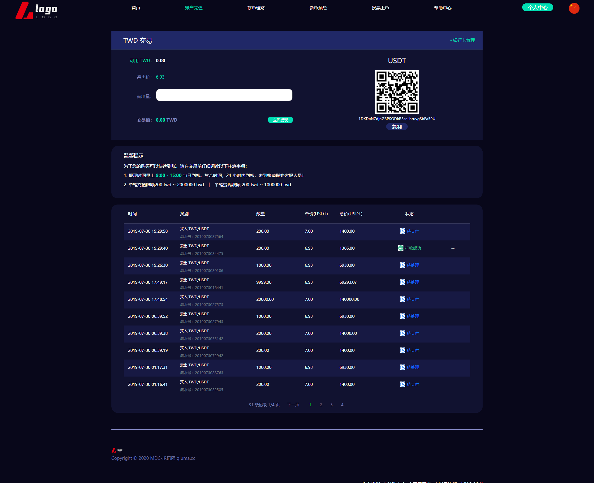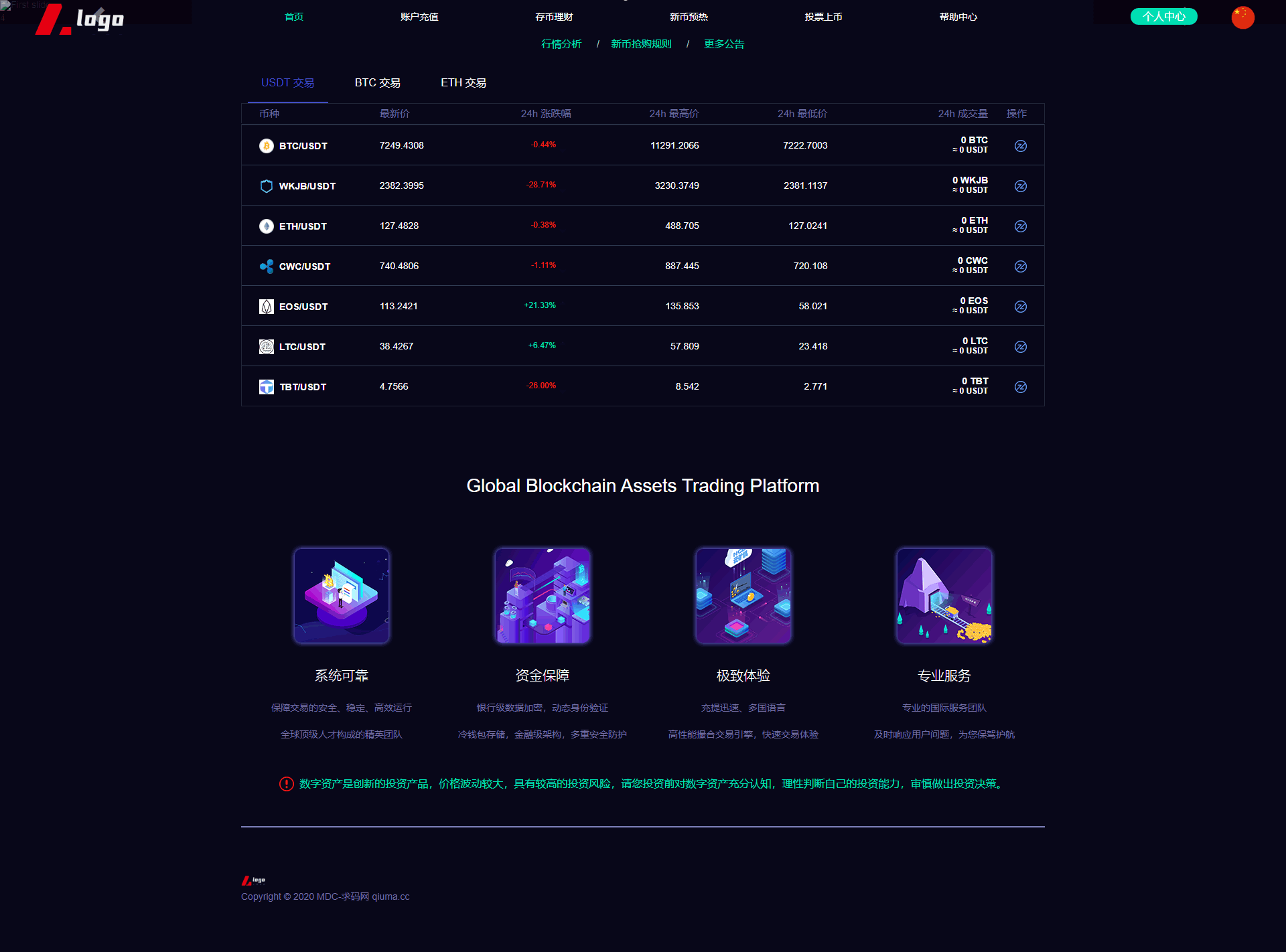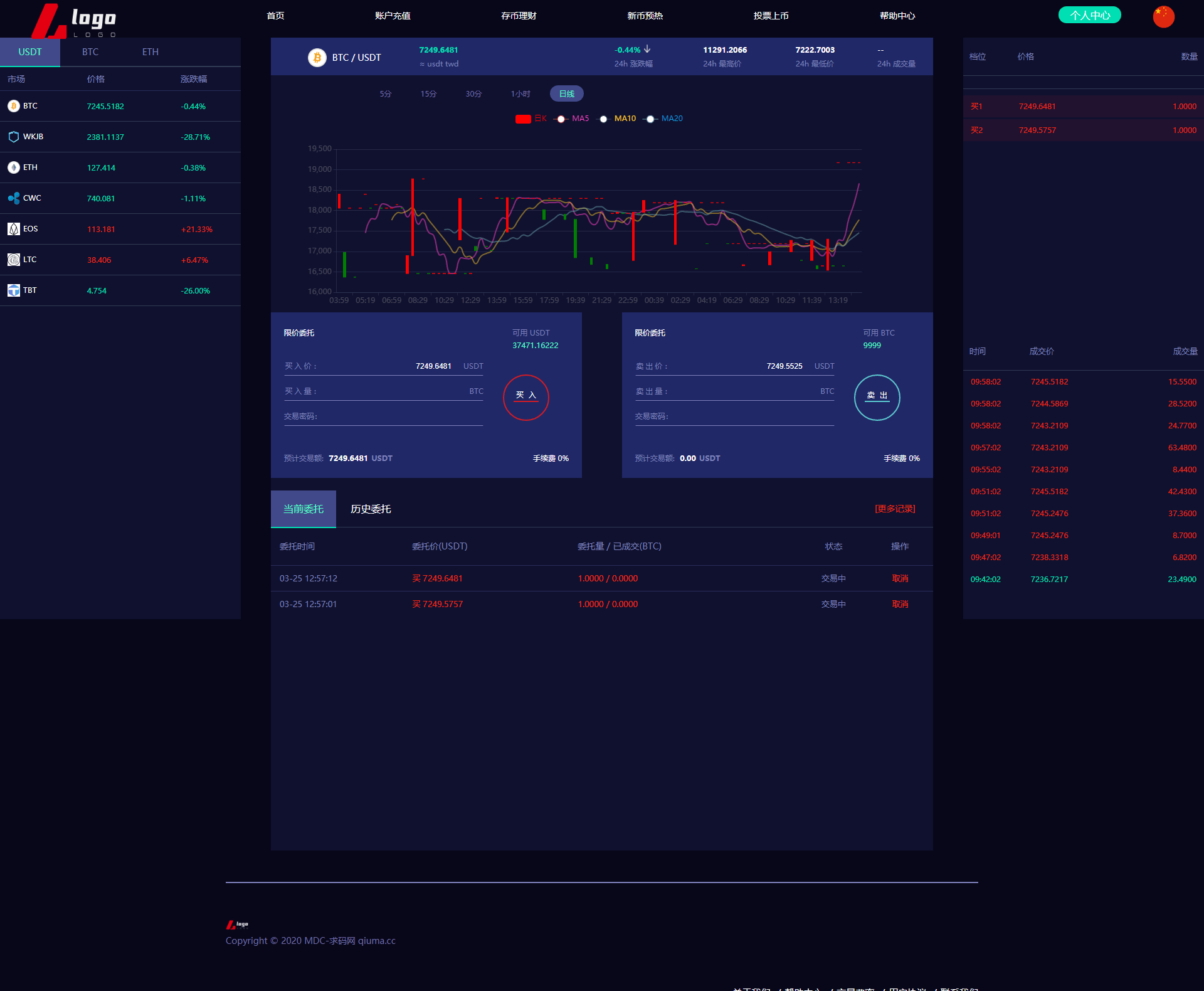 新版数字币交易所/数字资产交易平台/区块链交易所/币币交易/代币开发/带走势K线/挂买挂卖 本系统为高端多语言多币种虚拟币交易系统 带币币交易 OTC下线交易 自动机器人 1.系统流畅、体验性更好(各类数据分析,财务明细设置等)。 2.用户管理(用户认证信息,实名信息及资料编辑等) 3.钱包管理(用户链上钱包地址管理,系统数据管理记录筛选); 4币种管理(后台自助币种添加,交易对添加,主流币更新数据); 5.币币交易管理(用户撮合管理,实名认证,审核标准); 6.前台基础信息(系统用户协议公告,轮播图,社群推广链接) 币币交易模式介绍: 币币交易主要是针对虚拟数字资产和虚拟数字资产之间的交易,以其中一种币作为计价单位去购买-币种 币币交易规则同样是按照价格优先时间优先顺序完成撮合交易。 C2C交易模式介绍: 交易双方根据需求在C2C交易平台上发布买币或卖币的交易信息。买卖双方根据约定的付款方式 线下完成交易,平台作为中间人从交易成功的每笔交易中收取一定比例的手续费。 OTC场外交易模式介绍: 是一套独立于交易所外的线下购买数字货的平台,商家可以在该平台上发布购买/出售广告 购买/出售用户通过线下转账的方式进行购买/出售,转账完成后平台会将冻结的数字货转给购买方。 交易矿模式介绍: 交易所平台拿出一定比例的手续费收入来返还给平台用户,返还的是平台币,交易所平台按照分配比例原则 拿出一定的比例作为矿奖励,矿是指在平台上进行交易,来逐渐解锁平台币,直至平台币全部反馈完成。这一类玩法对吸引用户有着强大的吸引力。