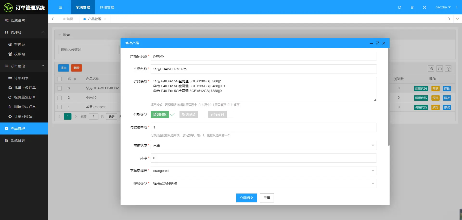 广告竞价页订单管理系统一个通用的广告(推广投放)竞价页订单管理系统,基于开源的caozha-admin开发,支持订单管理、订单回收站、产品管理、批量上传订单、批量导出订单(支持导出格式:.xls,.xlsx,.csv)、检测订单重复、竞价页的下单表单调用、客户下单时给管理员发邮件(短信)提醒等功能,内置灵活的查看订单权限设置机制。