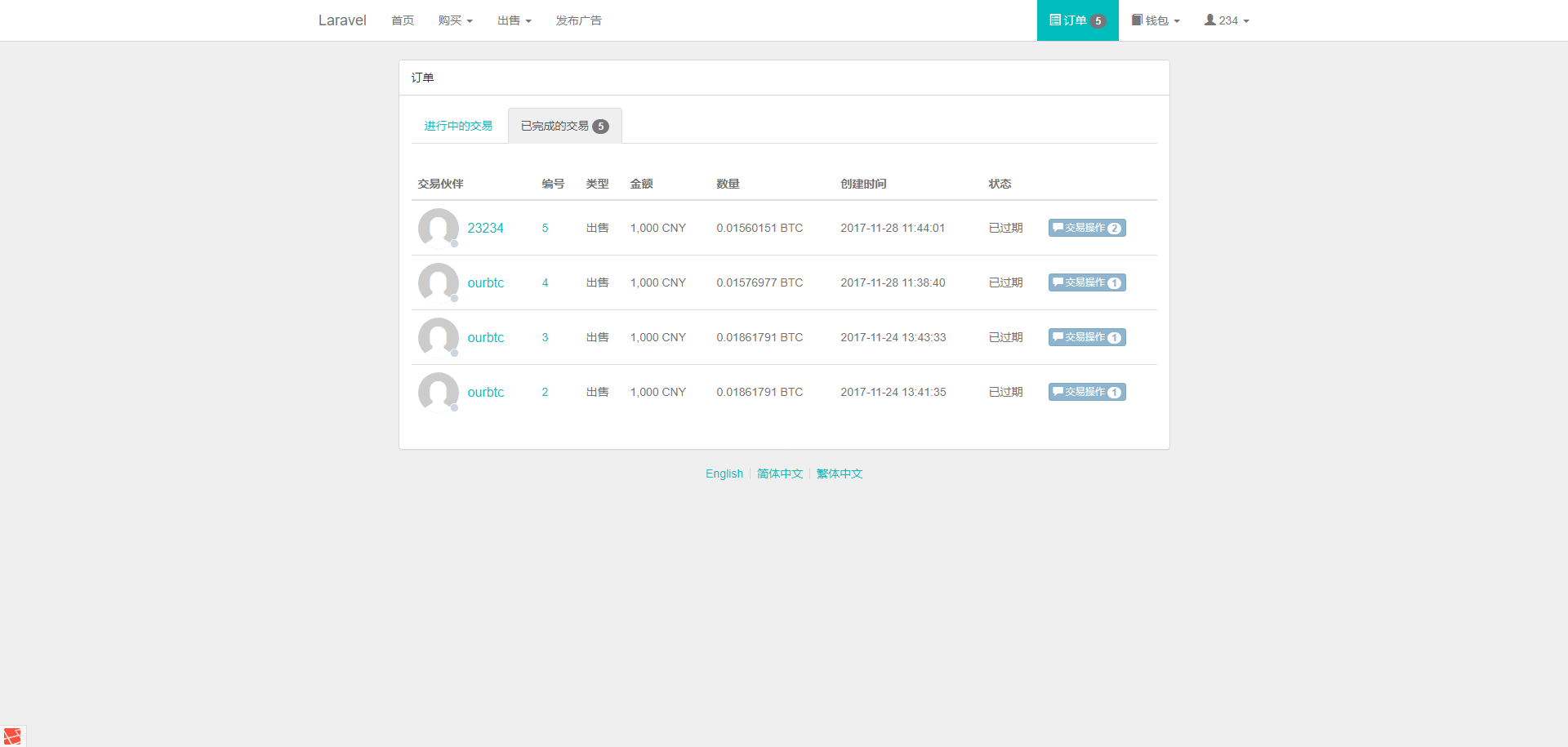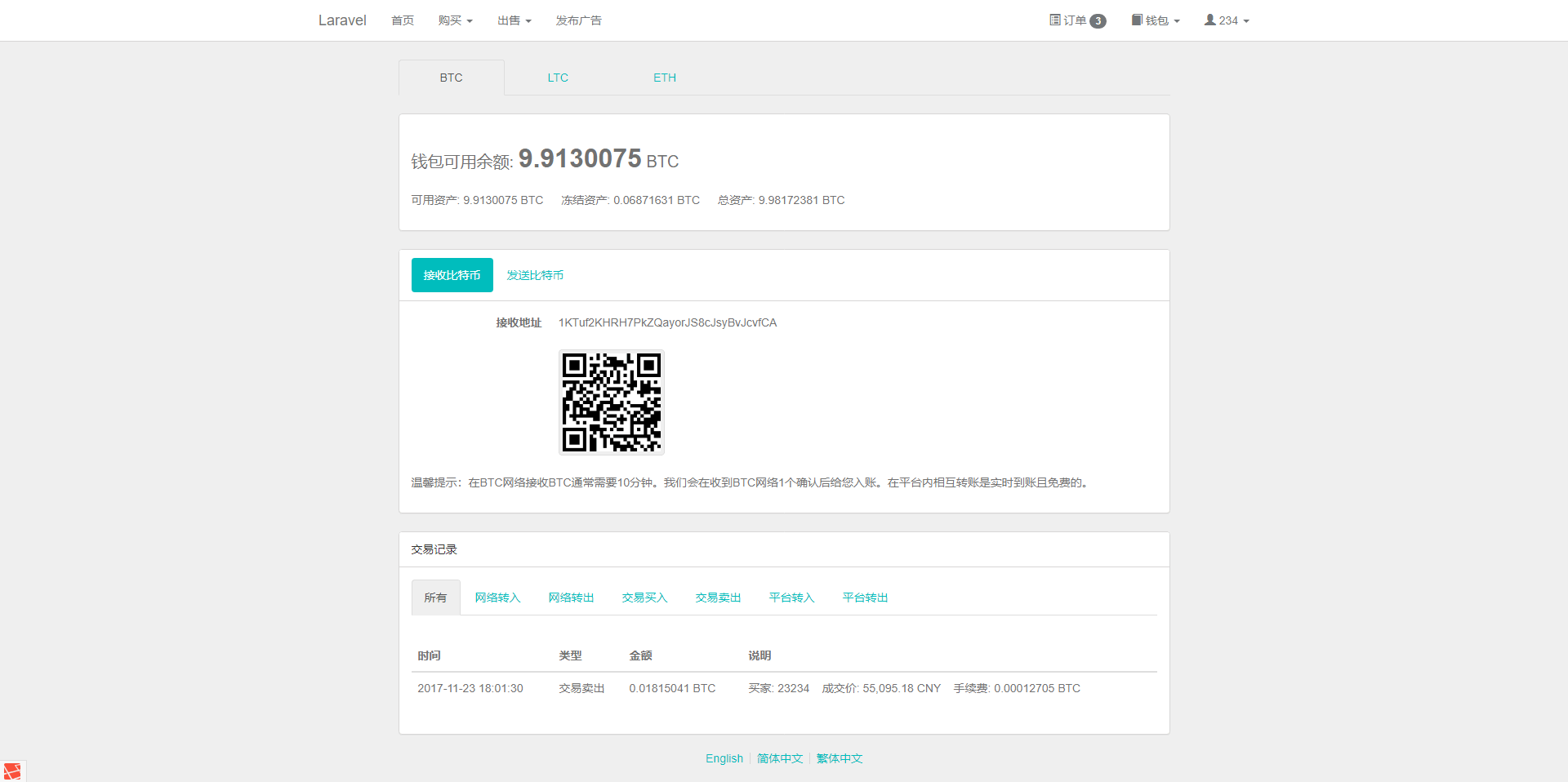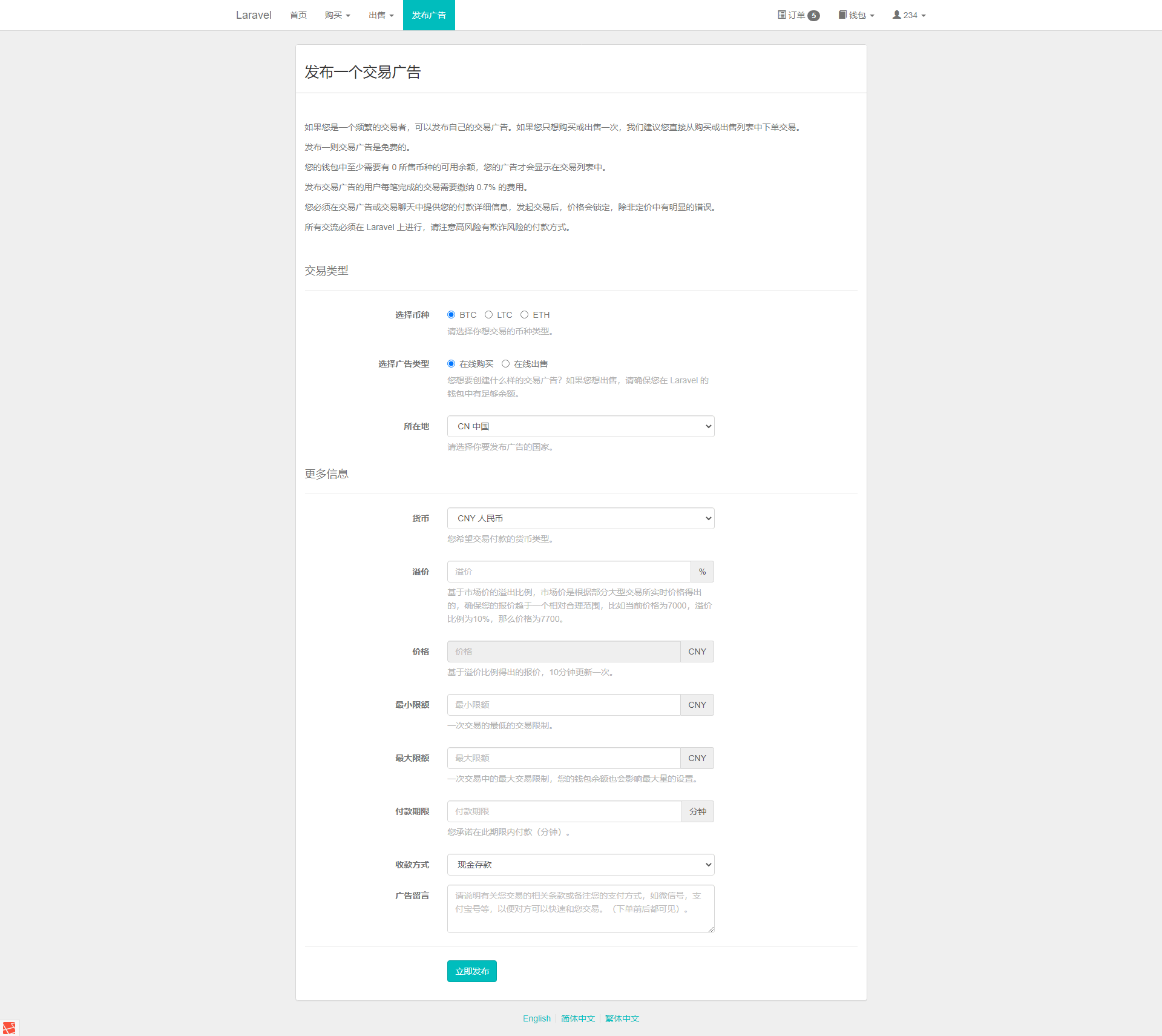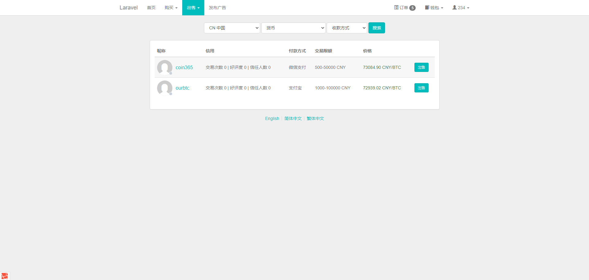 中英繁版)虚拟币交易/场外交易/点对点/OTC交易系统/虚拟币场外交易平台 OTC场外交易,即托管在平台,由买家给卖家打款,卖家确认收款的形式进行交易,法币现金不经过平台。 系统使用 Laravel 5.5 开发,拥有可靠的安全性、稳定性与拓展性,金融级别的安全。 功能列表: 1. 发布购买与出售广告。 2. 搜索已发布的广告。 3. 向广告购买与出售。 4. 订单创建与付款时的短信通知。 5. 在订单内买家与卖家实时聊天。 6. 托管与释放。 7. 交易完成后的双方评价。 8. 信用体系,包含交易次数、好评率、信任人数。 9. 实名认证,防止洗钱等非法交易对平台的影响。 10. 充值与提现,支持离线钱包,自动识别到账。 11. 多国语言支持。 12. 国内与国际短信验证码与通知。 13. 邮箱绑定。 14. 谷歌两步验证。 15. 修改头像与个人简介。 16. 用户在线状态,让交易更有效率。 17. 可以信任与屏蔽用户。 18. 支持全球171个国家的汇率计算。 19. 后台四层权限控制,高安金融。 20. 多币种支持,目前可集成: btc、ltc、eth、wkc等市面货币。