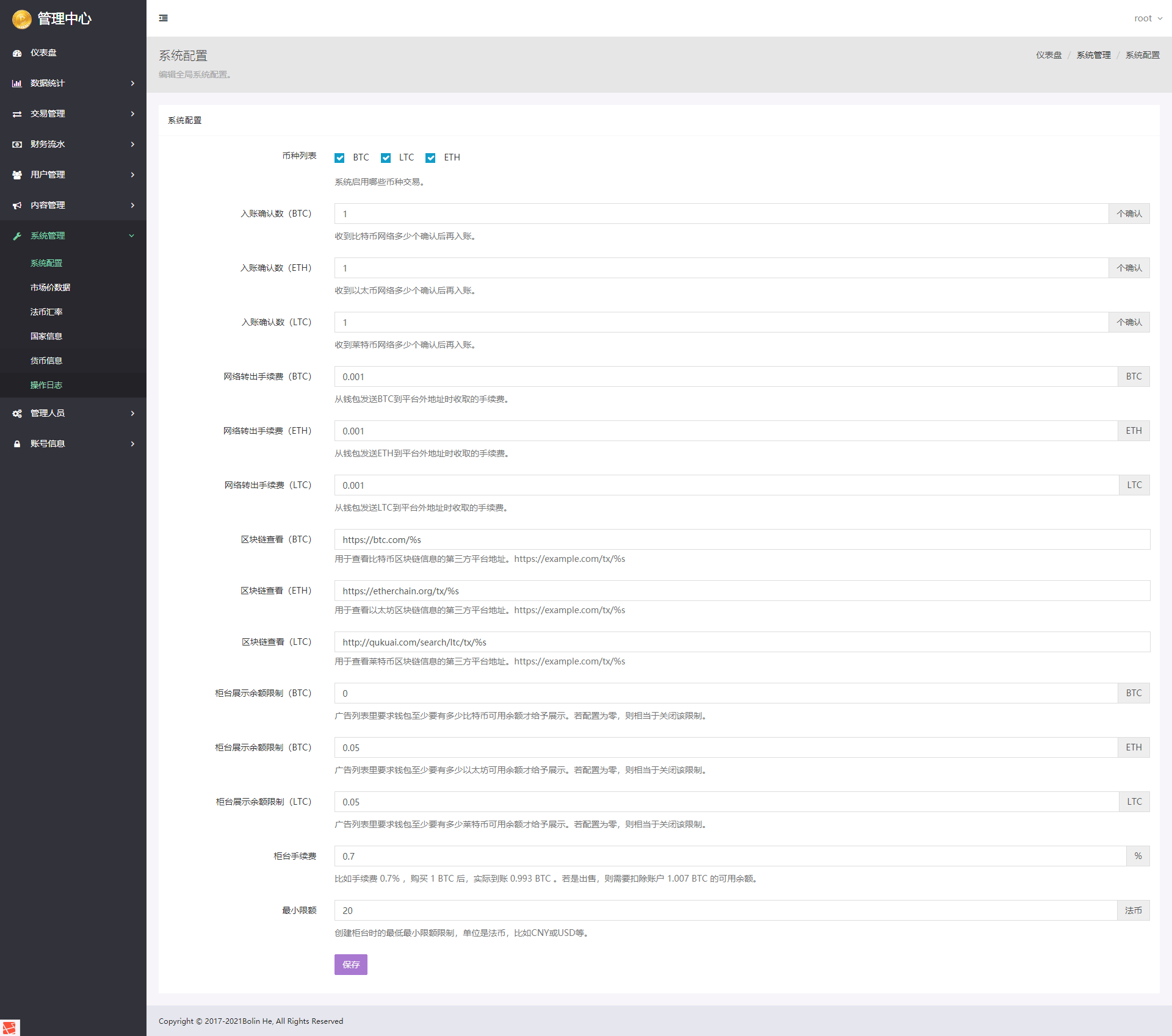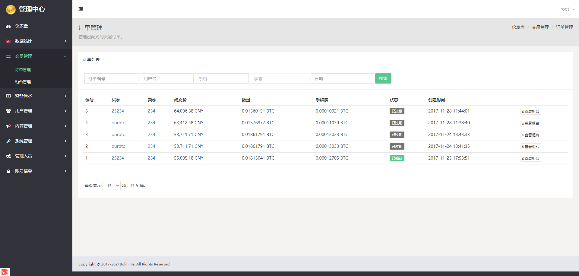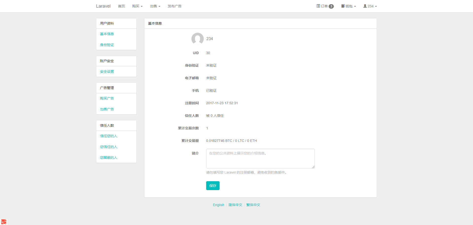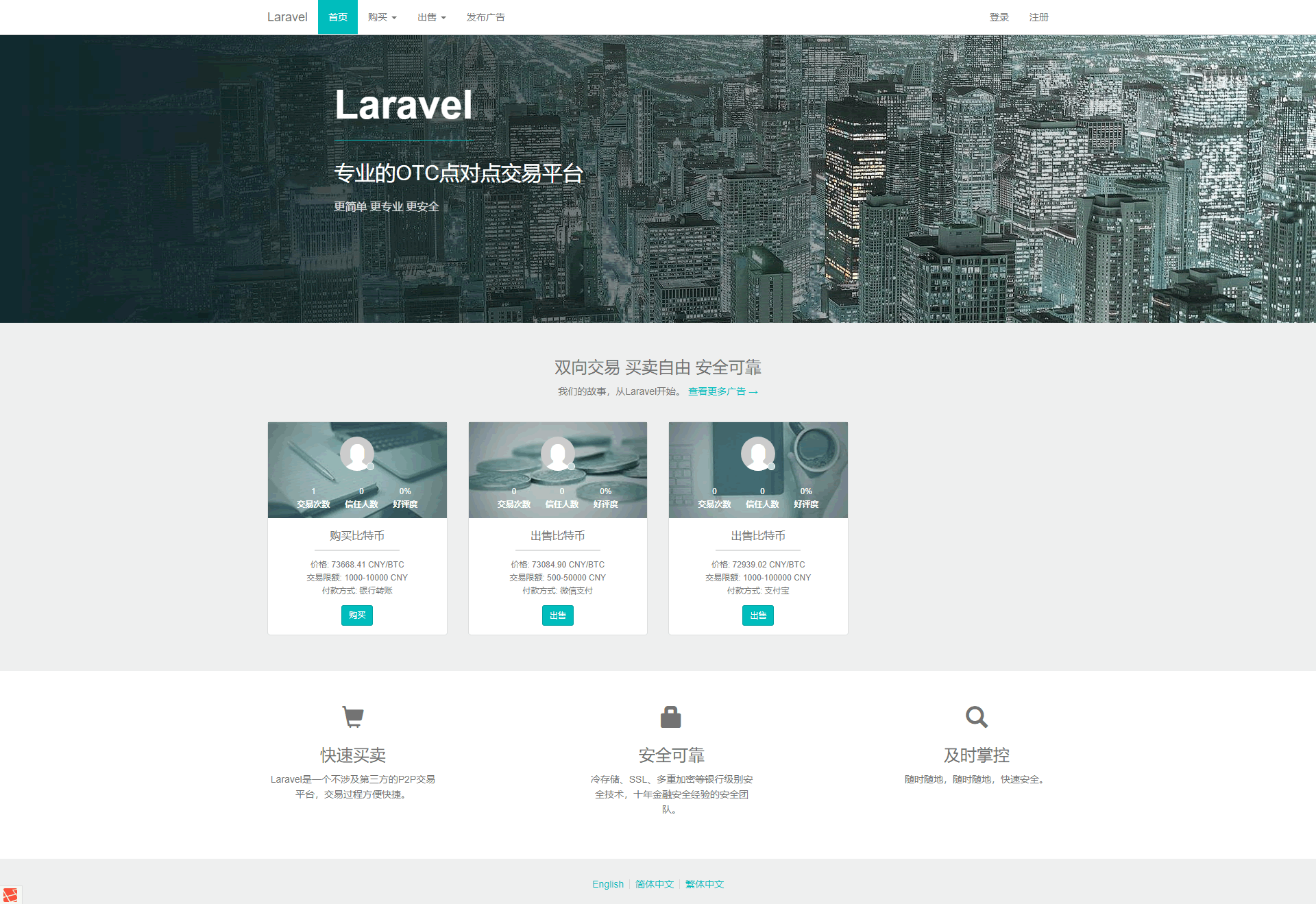 中英繁版)虚拟币交易/场外交易/点对点/OTC交易系统/虚拟币场外交易平台 OTC场外交易,即托管在平台,由买家给卖家打款,卖家确认收款的形式进行交易,法币现金不经过平台。 系统使用 Laravel 5.5 开发,拥有可靠的安全性、稳定性与拓展性,金融级别的安全。 功能列表: 1. 发布购买与出售广告。 2. 搜索已发布的广告。 3. 向广告购买与出售。 4. 订单创建与付款时的短信通知。 5. 在订单内买家与卖家实时聊天。 6. 托管与释放。 7. 交易完成后的双方评价。 8. 信用体系,包含交易次数、好评率、信任人数。 9. 实名认证,防止洗钱等非法交易对平台的影响。 10. 充值与提现,支持离线钱包,自动识别到账。 11. 多国语言支持。 12. 国内与国际短信验证码与通知。 13. 邮箱绑定。 14. 谷歌两步验证。 15. 修改头像与个人简介。 16. 用户在线状态,让交易更有效率。 17. 可以信任与屏蔽用户。 18. 支持全球171个国家的汇率计算。 19. 后台四层权限控制,高安金融。 20. 多币种支持,目前可集成: btc、ltc、eth、wkc等市面货币。