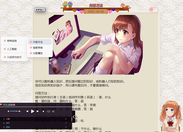 你可以教机器人知识,然后提问教过的知识,或她已知的知识。