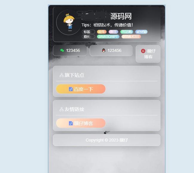 毛玻璃效果:毛玻璃效果(也称为模糊背景或Blur Effect)是这款源码的一大亮点。通过在元素上应用模糊滤镜,创造出一种半透明且带有朦胧美感的视觉效果。这种效果不仅提升了页面的美观度,还增强了用户的视觉体验。在CSS3中,filter属性和backdrop-filter属性共同实现了这一效果,允许对背景图片或元素进行模糊处理,为设计增添层次感。