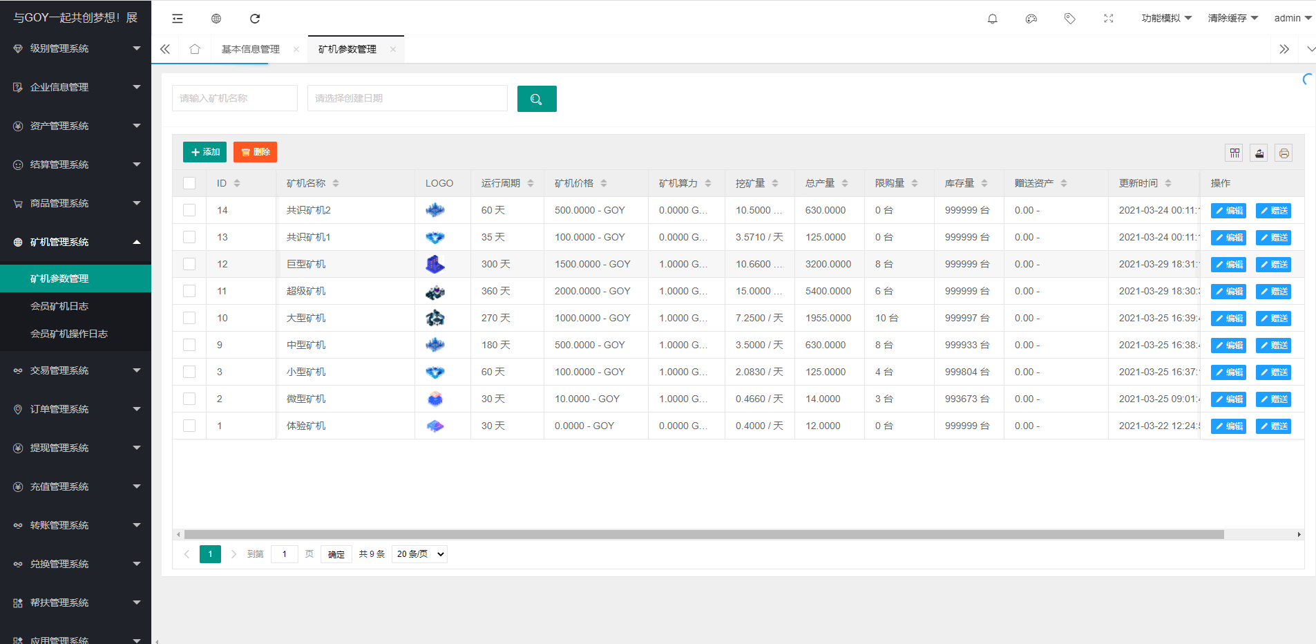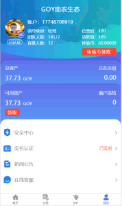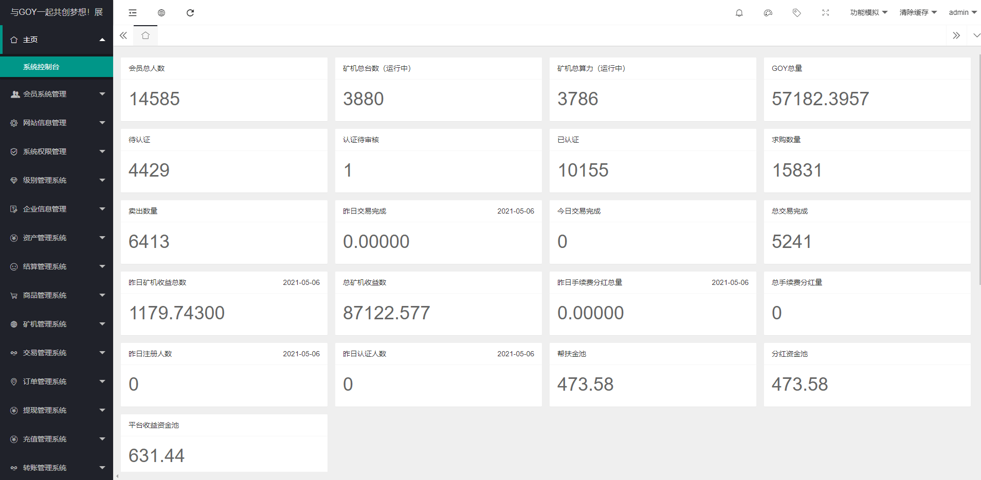 GOY助农生态链/矿机系统/收益交易系统/推广帮扶 大概看了下系统具体功能还说很不错的,大概就是推广下级可以获得虚拟币收益,六层团队下级收益 虚拟币获得渠道可以购买矿机获得,也可以推广下级获得 附带虚拟币的交易系统,具体功能懂得都懂,需要的拿无售后,源码自行研究