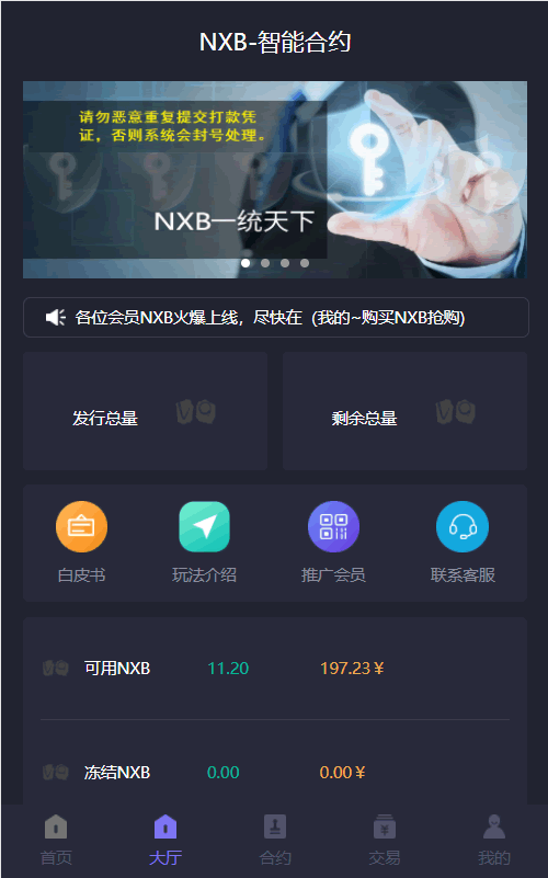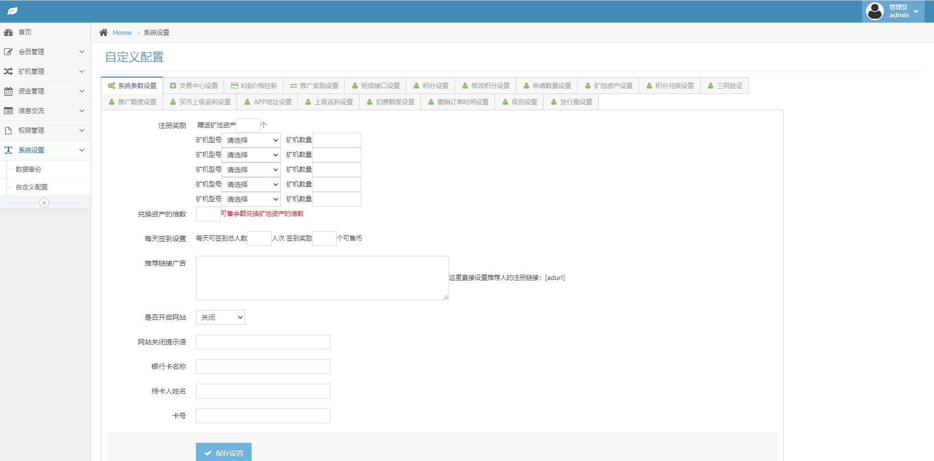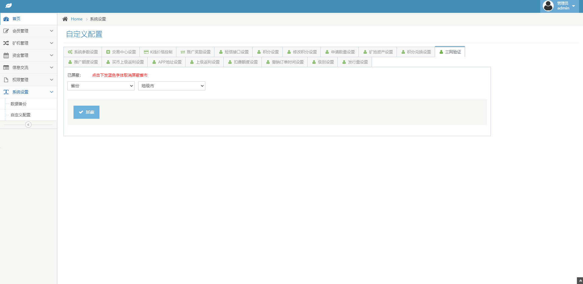 全新UI区块链挖矿系统,新增屏蔽省市,运营级云矿机,带交易大厅可二开 全新UI设计,界面高端大气上档次 合约大厅实时兑换矿机,我的合约一键领取矿机产量 交易大厅-求购订单 发布订单等 新增人机验证注册 后台团队树形图,快速掌握团队情况 后台赠送矿机,矿机记录,赠送可售币,可售余额等。 后台矿机管理,订单明细等。 最重要的,自定义配置,功能多到无法想象