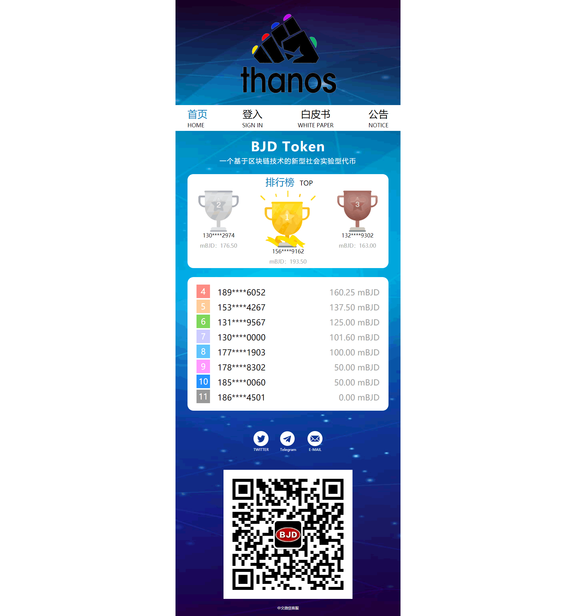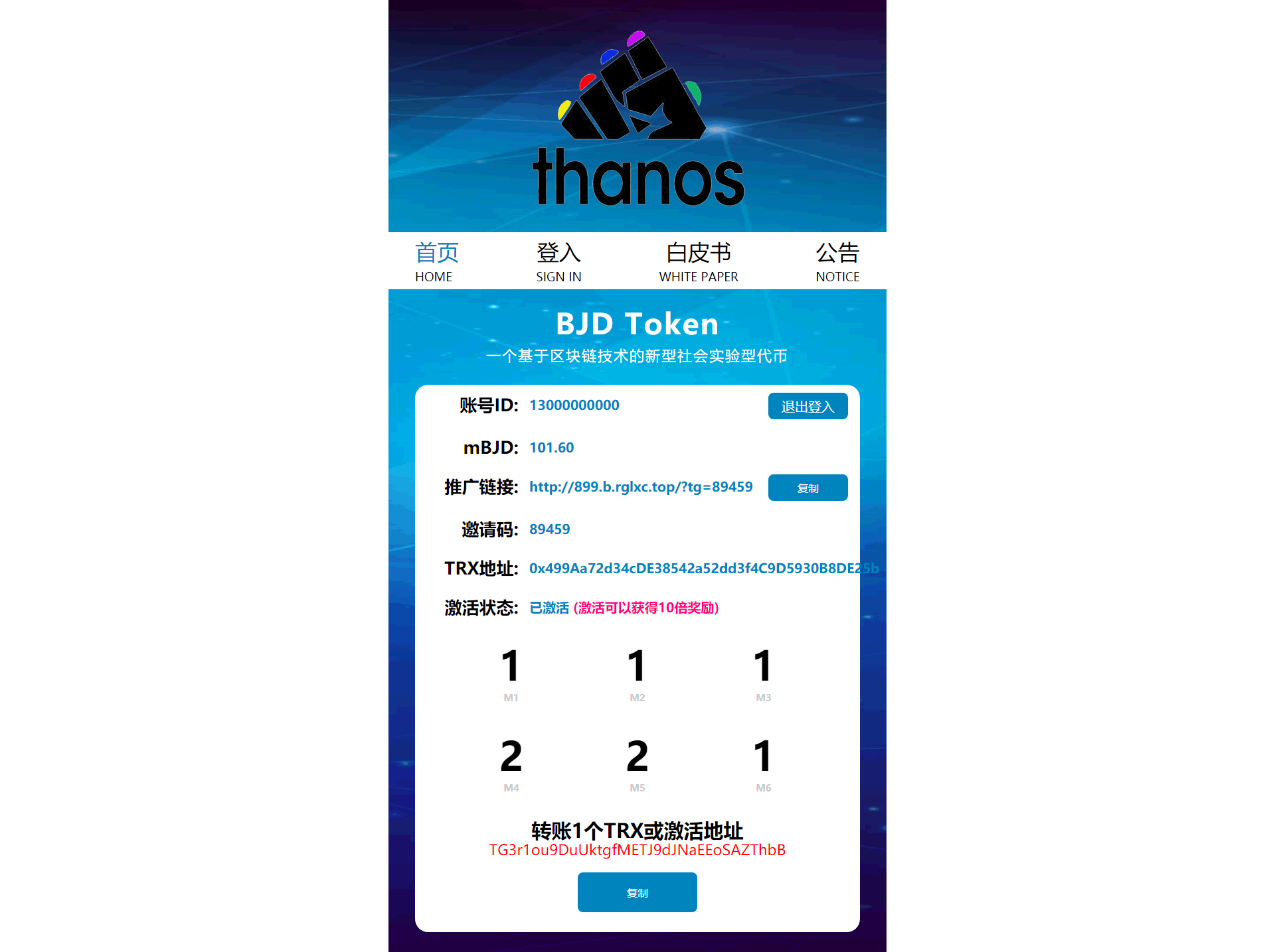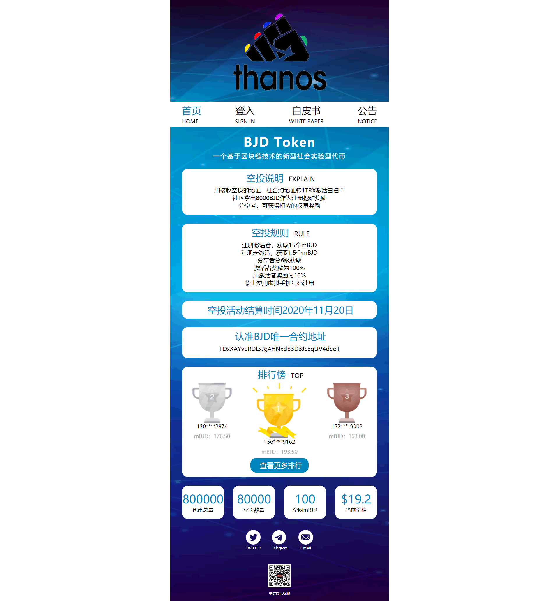 注册绑定TRX地址,带6级推广奖励。推广下线激活后,获取10倍收益 空投说明 用接收空投的地址,往官方地址转1TRX激活白名单 社区拿出8000BJD作为注册挖矿奖励 分享者,可获得相应的权重奖励 空投规则 注册激活者,获取15个mBJD 注册未激活,获取1.5个mBJD 分享者分6级获取 激活者奖励为 未激活者奖励为10% 禁止使用虚拟手机号码注册