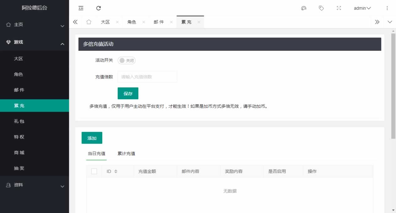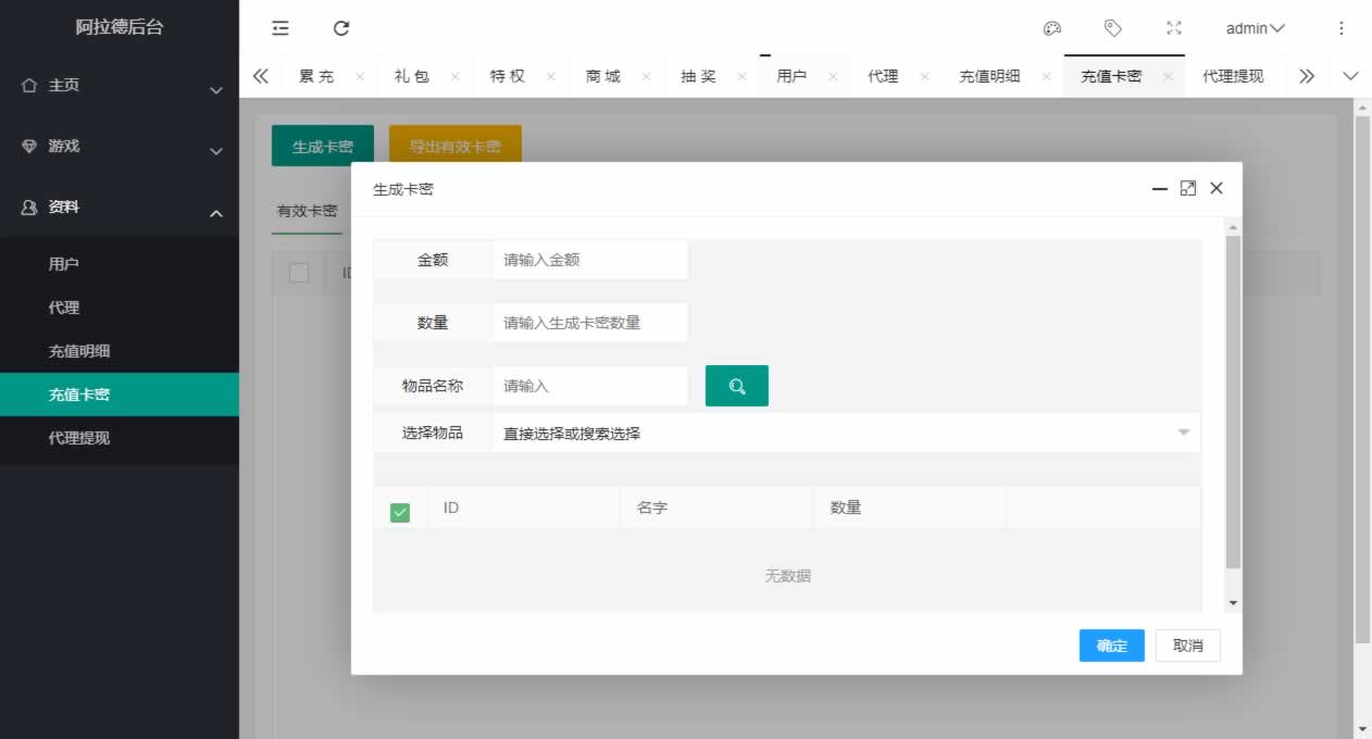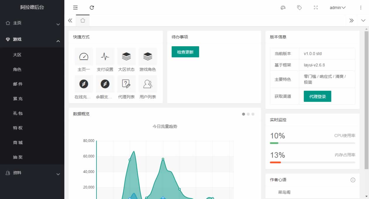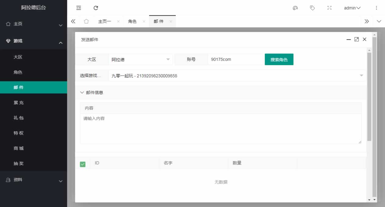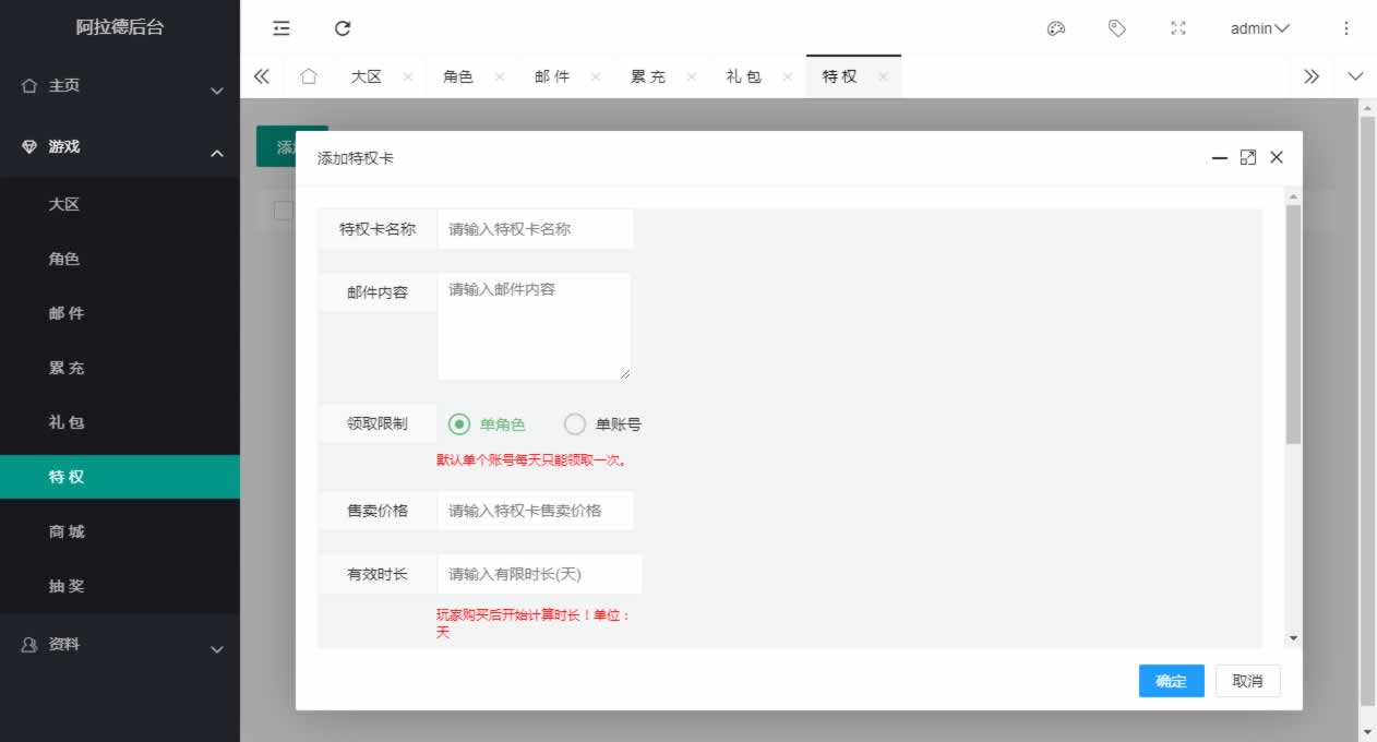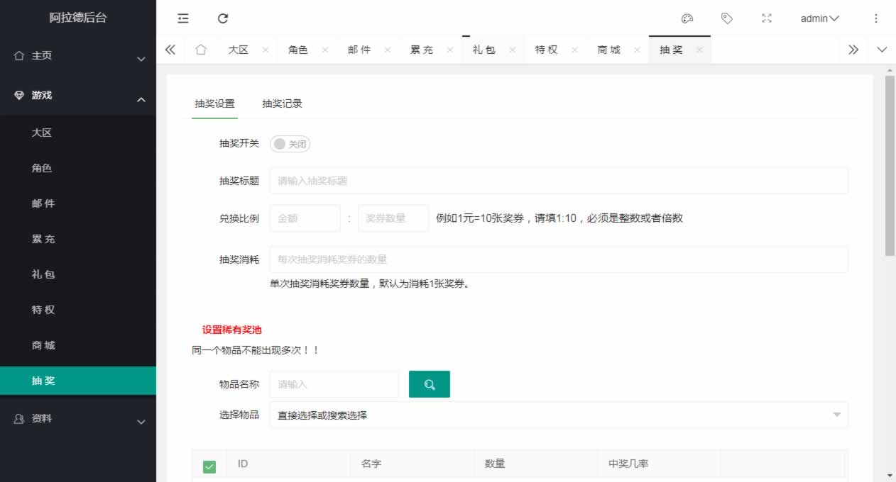 阿拉德全功能运营后台,包含代理、邮件、礼包、商城、特权、商城、抽奖等等功能,全部源码都是没有加密的,有能力可二开,以前的版本如全明星、名望等可以直接使用,最新的米亚大陆,需要自行二开修改了,大部分功能都是通用的,仅供群友研究!!!