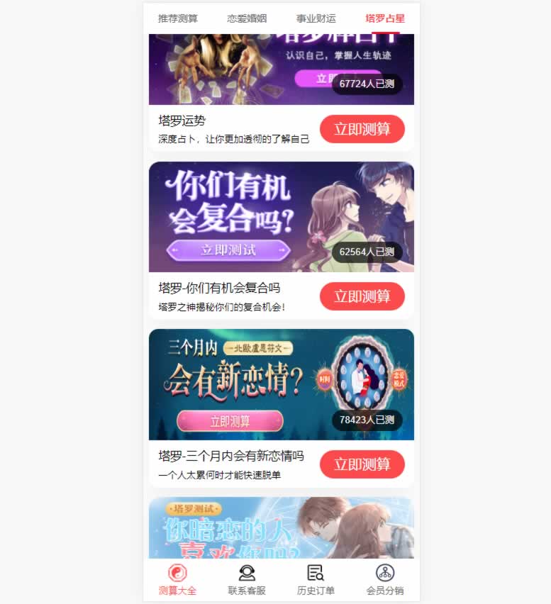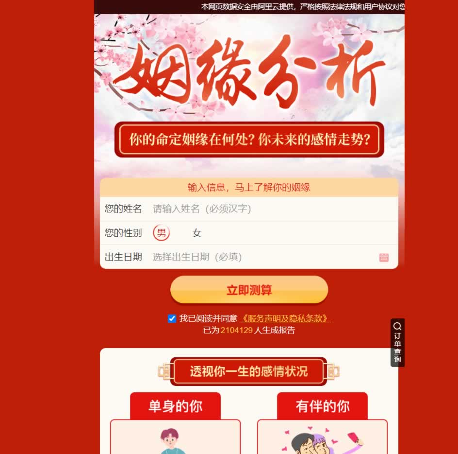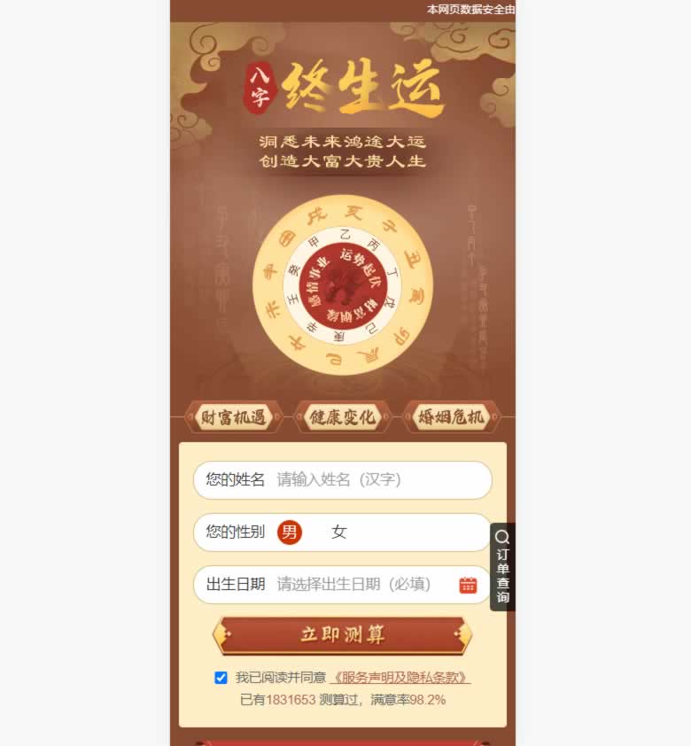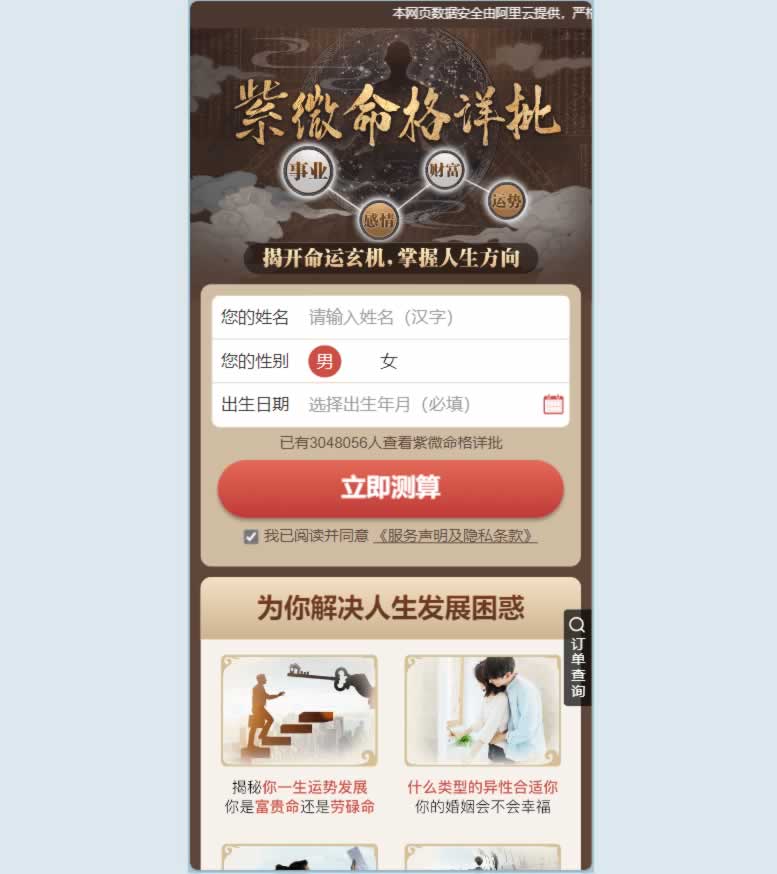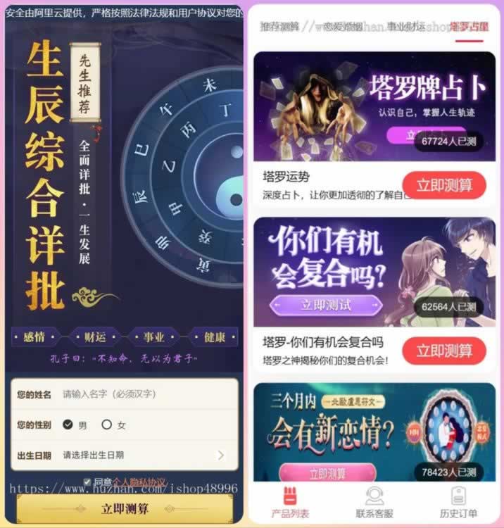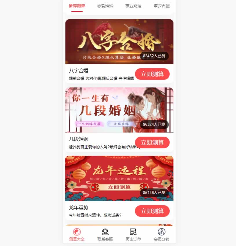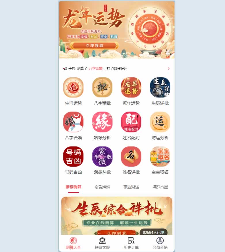 八字精批、事业财运、姓名分析、宝宝起名、姓名配对、综合详批、姻缘测算、八字合婚、紫微斗数、龙年运程、月老姻缘、号码解析、塔罗运势、塔罗爱情等。
