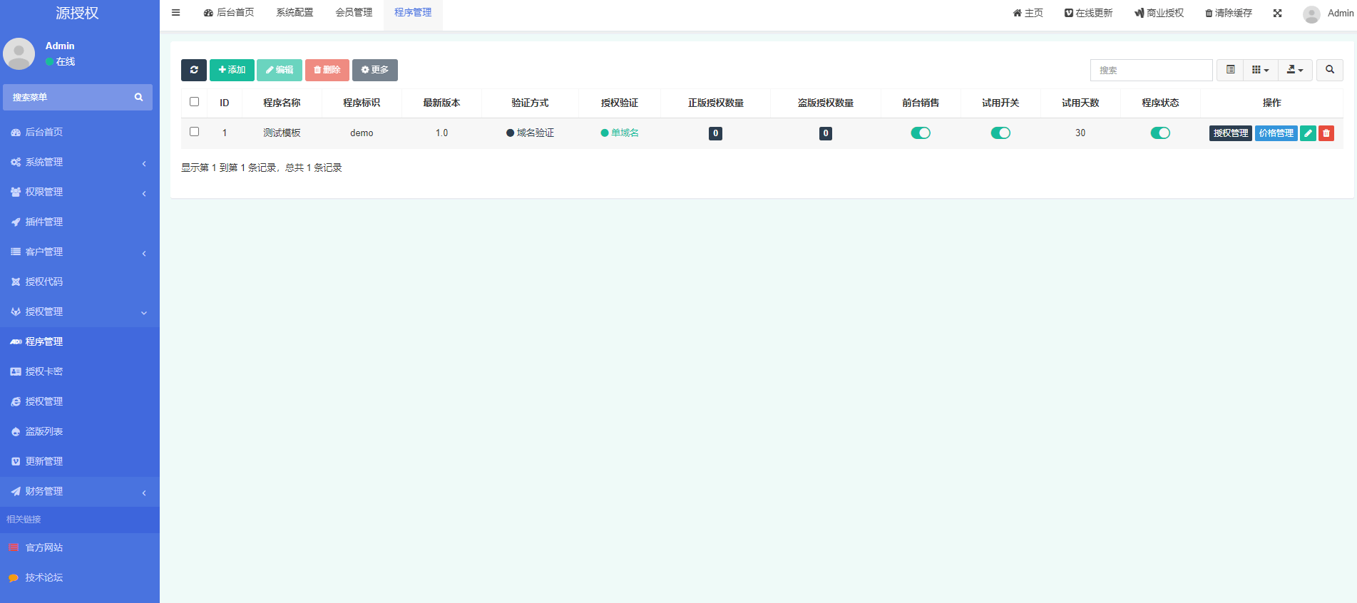 源授权是一款全新架构的授权系统.采用thinkphp 5.0开发,内置各种强大的功能,邮件管理,腾讯云短信、阿里云短信等.后台强大简洁,使用方便快捷,支付模块集成易支付功能,前台支持自助购买和操作管理授权! 服务器环境要求的配置:PHP 7.2+ 和 Mysql 5.6(推荐使用linux版本宝塔进行管理搭建,完美) 基本功能 支付接口集成了易支付 前台可使用卡密授权激活 支持多程序在线自助授权 短信集成腾讯/阿里云短信 支持前台在线充值支付购买 快捷登录方式集成了QQ/微信/微博 可自行对管理权限进行补差价升级 安全 稳定 简约 新UI · 告别繁琐操作 多端授权 · 一站多控 · 授权统一管理方便快捷 更新日志 V1.6 – 2021.10.04 优化程序管理,显示程序名称,数据统计 修复创建程序后创建时间不显示问题 更新卡密状态,类型,使用天数,名称的显示 更新API返回信息同步后台授权返回设置项 修复授权验证不存在问题 修复后台首页报错问题 修复无法新增程序 V1.5 – 2021.10.02 程序标识改为随机生成,8位不重复数字+字母组合 授权方式改为多选方式,更加灵活方便 增加授权码授权方式,域名、IP、授权码三种方式任意组合 增加程序管理中试用授权数量显示 API地址更改,API检测代码重构 站点授权管理查询新增Tab页,正式授权以及试用授权 站点授权中逻辑修改,改为继承程序管理中设定作为判定条件 授权管理新增授权授权码自动生成,可在修改中点击重置进行更改 修复授权状态判断无效问题 盗版管理新增盗版类型,UI优化,查看更加方便快捷