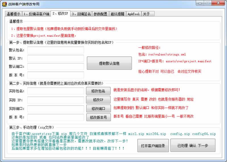 战神客户端修改辅助,有些群友反馈,客户端修改老是有问题或者不会装JAVA环境,这个工具整合了环境,可以直接操作,编译,回编,能自动修改IP、包名等操作。