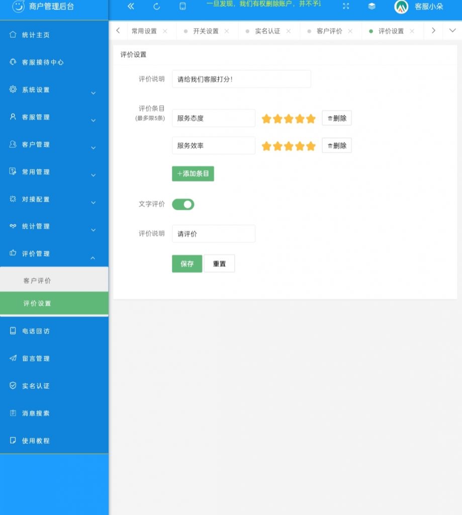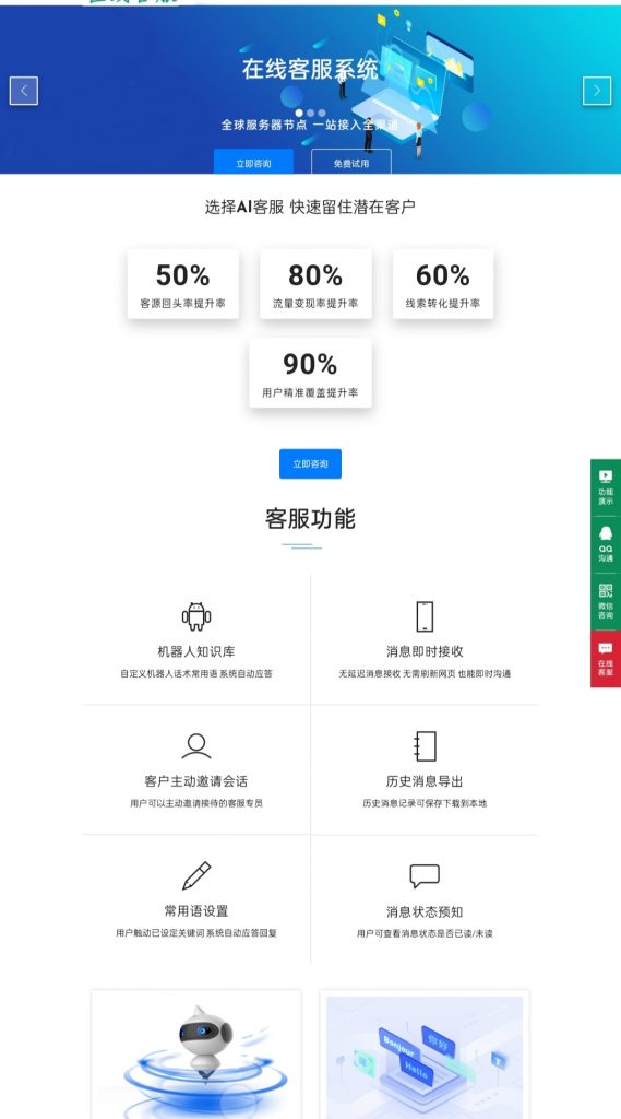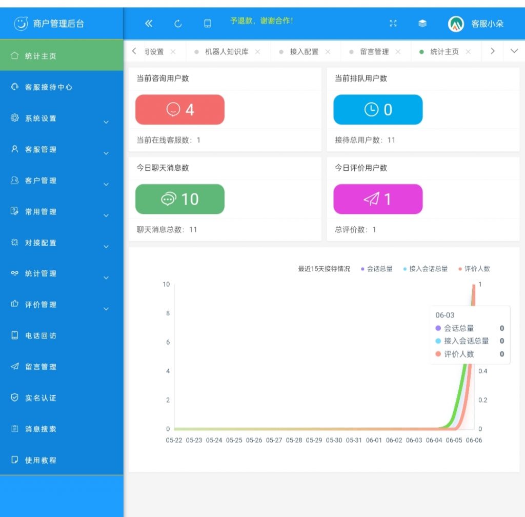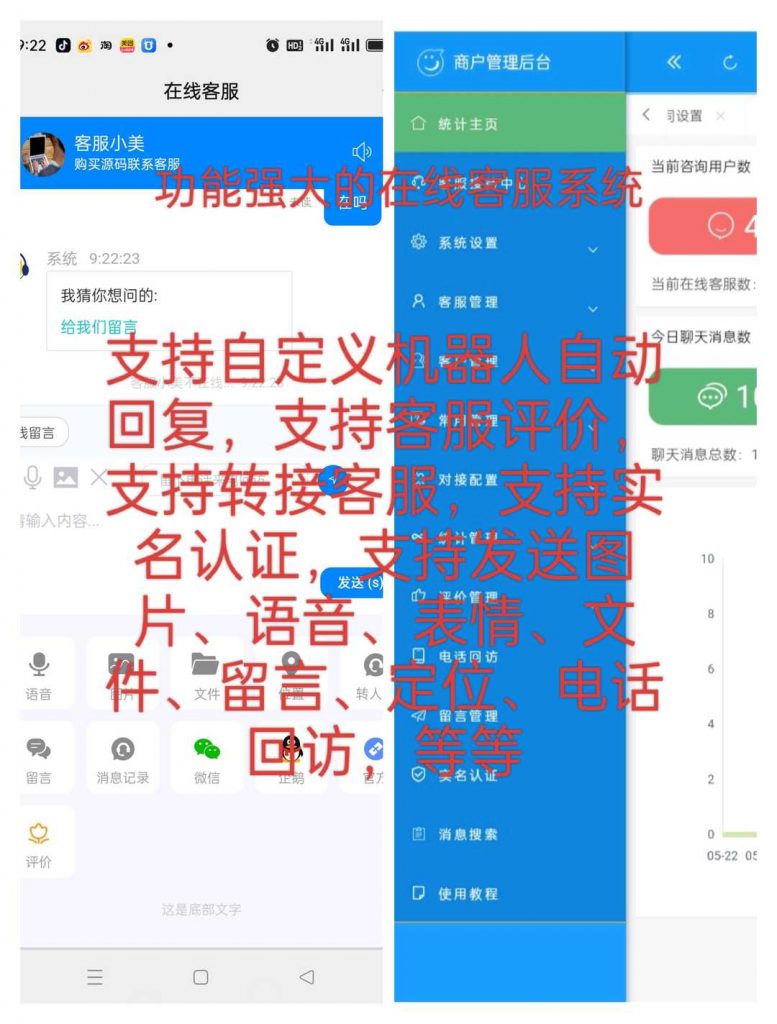 支持自定义机器人自动回复,支持客服评价,支持转接客服,支持实名认证,支持发送图片、表情、文件等等…
