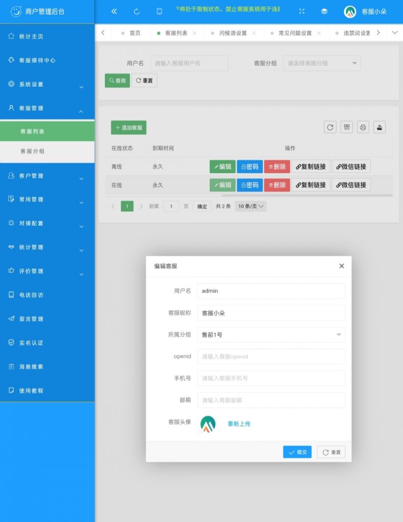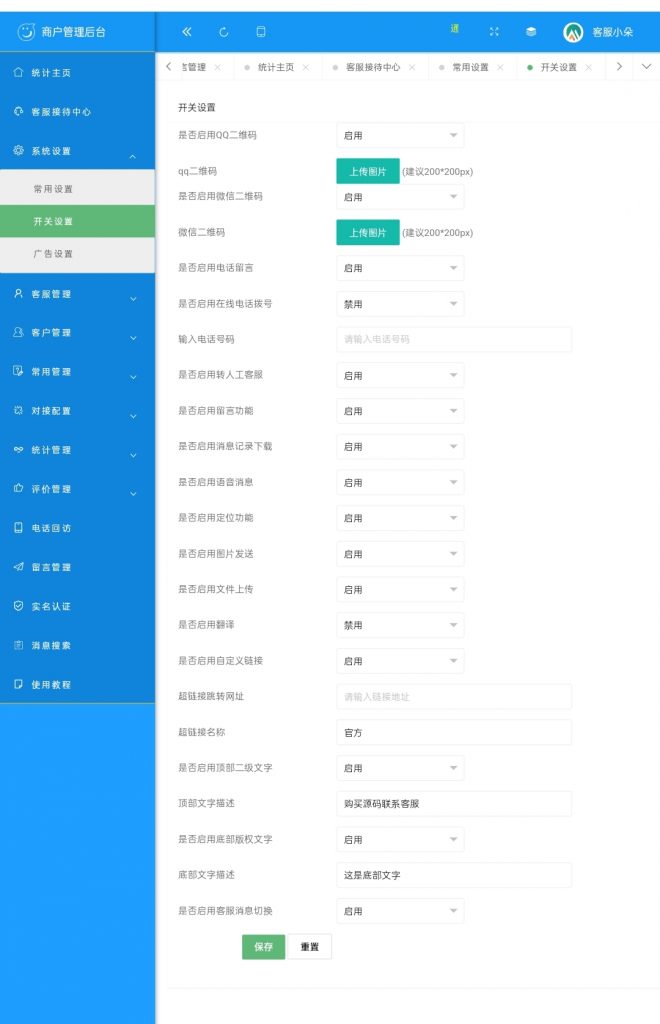 源码带总后台(可以添加或自助注册客服用户,支持控制创建客服数量及有效期),支持客服分组,支持快捷回复设置。