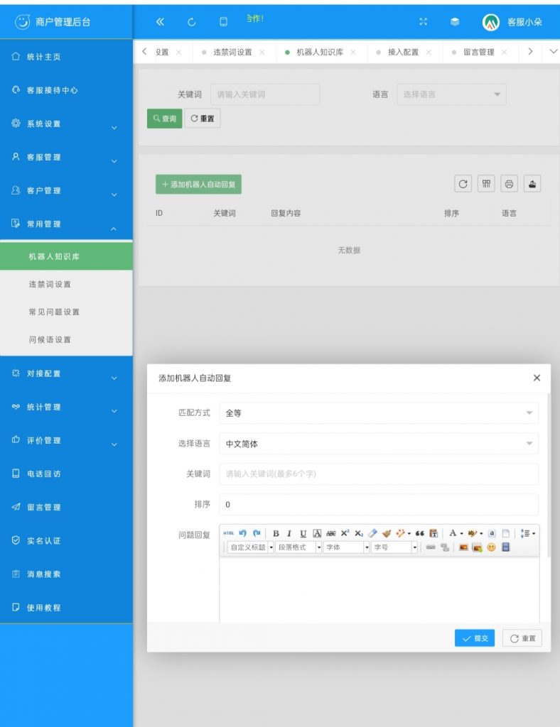 该款客服源码带预知功能(用户前台在输入框输入未发送的信息在后台也能看到),后台支持问候语、常见问题设置。