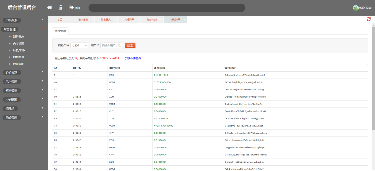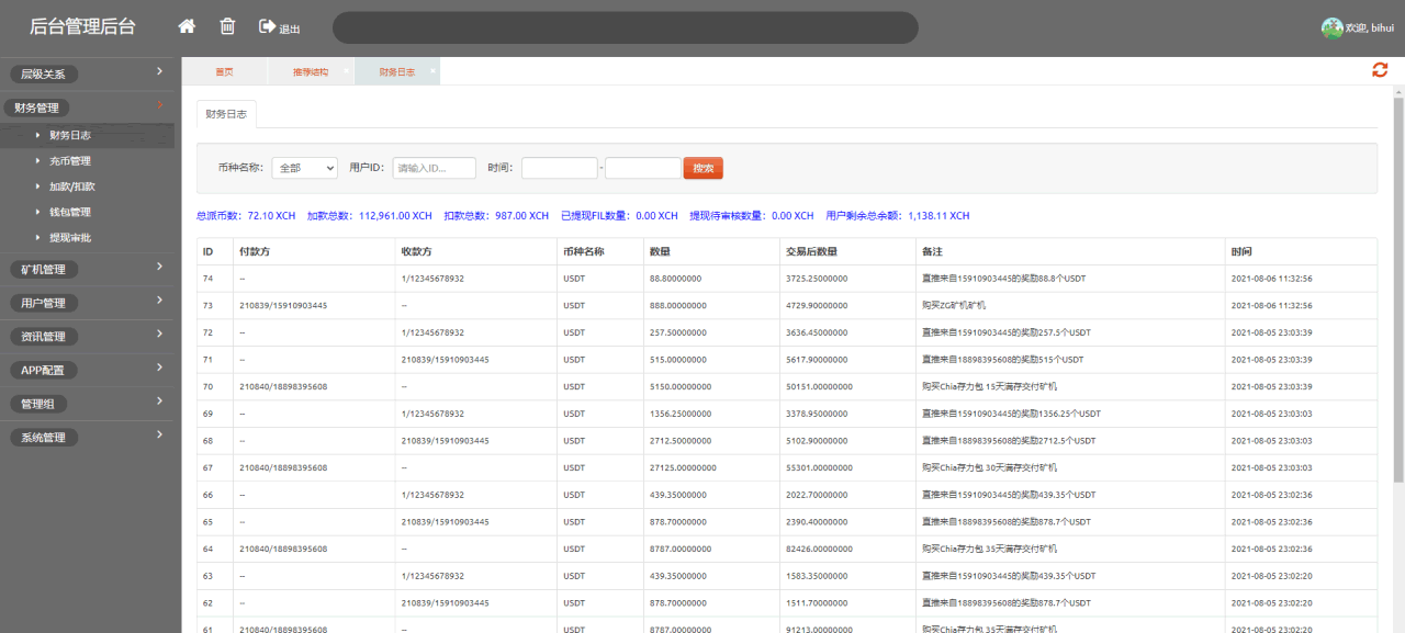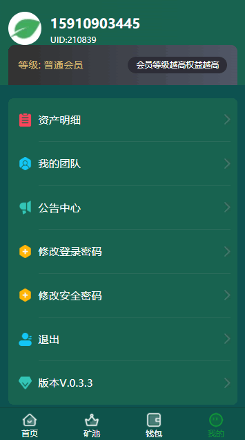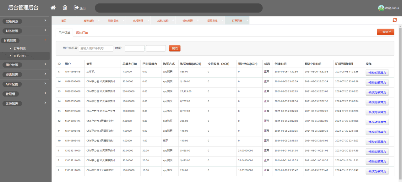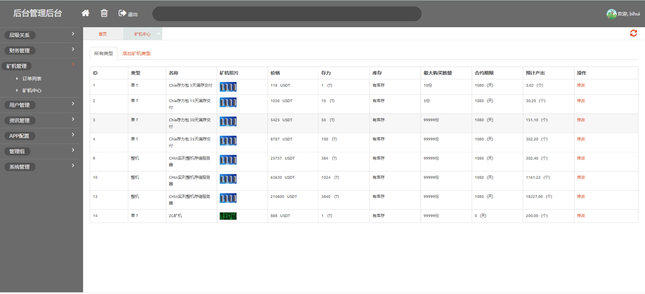 1、可以使用usdt购买矿机,可上线多币种,上交易所以后,USDT充值 官网行情数据接口 平台转账,coinbase接口所有币种自动换算人民币 2、直推奖励,根据矿机购买币种不同,而不同 3、无线性释放,矿机所产收益,自动扣除技术服务费,剩余一次性到账结算,每天凌晨2点结算前一天的矿机收益 4、矿机有封装期,封装期不产币,封装多少,按封装多少自动产币封装期结束以后自动开始结算收益 5、根据区块浏览器的实时产币信息,后台填写每T的产币量,用于结算 6、有直推奖、团队奖、产能奖、同级奖,间推奖,可以定制 7、后台可管理会员信息、矿机信息、奖励信息