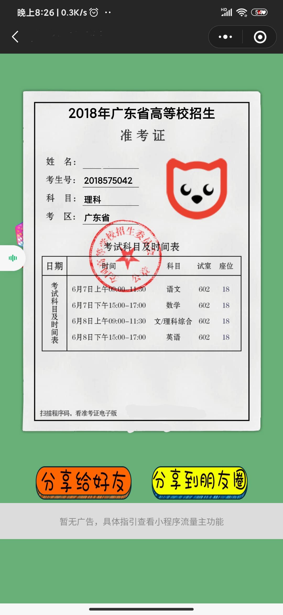 相信大家看标题也就知道这是一个什么东西啦! 你们猜的没错,这是一个准考证制作娱乐小程序 用来恶搞等等娱乐 小程序自带背景音乐,非常适合毕业季 另外拥有自定义高考年份,头像,高考省份等等 另外也支持流量主 喜欢玩的小伙伴可以详细研究!无广告哈!