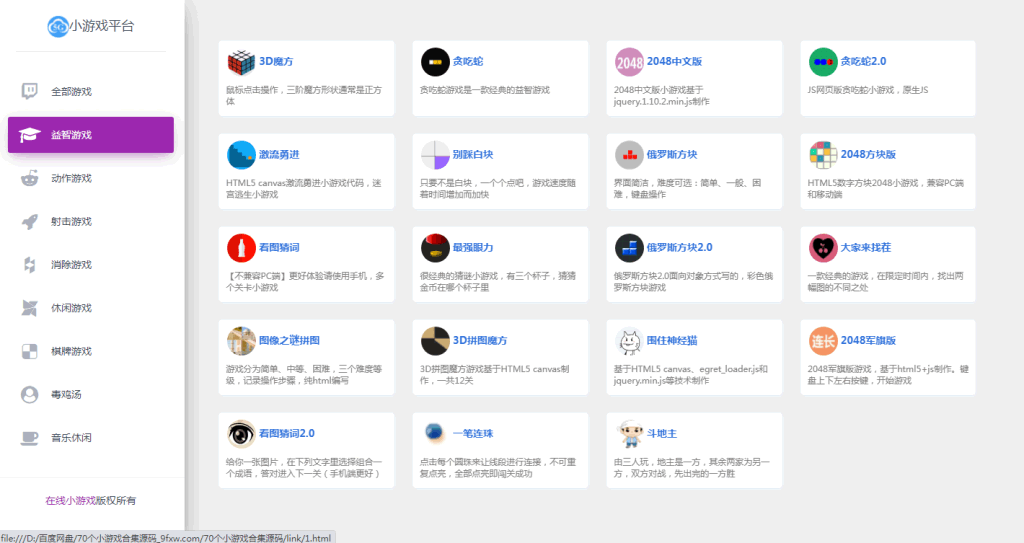 这套源码可真是实打实的网站流量之王,轻松让你的网站拥有一个70多个小游戏的分栏目,这套源码直接上传到服务器就就可以访问运行了,也可以在本机运行,全站静态,不占用服务器资源。源码里面游戏太多,没有一一截屏,感兴趣的自己拿去测试。