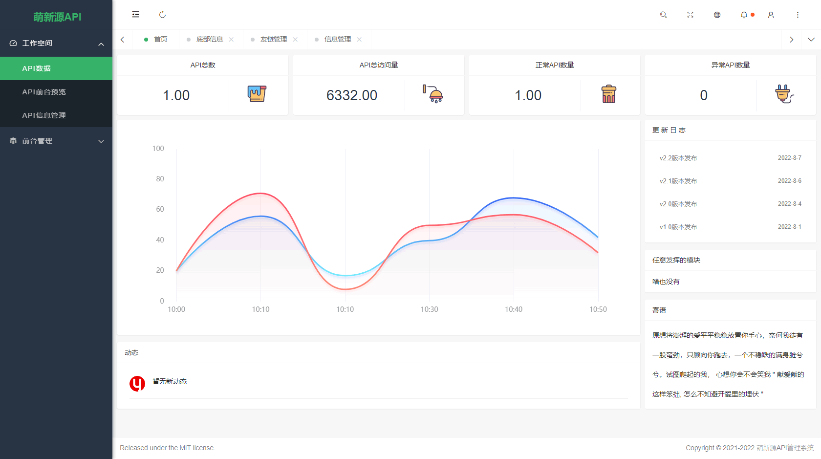 萌新源API管理系统是一款基于layui和pear-Admin-layui前端框架 以及国产thinkphp后端框架开发的API管理后台系统。该系统的运行环境要求 PHP7.3以上版本,数据库支持MySQL。 该系统提供了友好的用户界面和操作体验,方便用户快速管理和使用API。 同时,该系统还支持常见的API管理功能,例如API接口调用、参数管理、权限控制、数据统计等等。