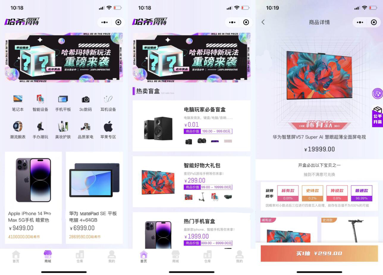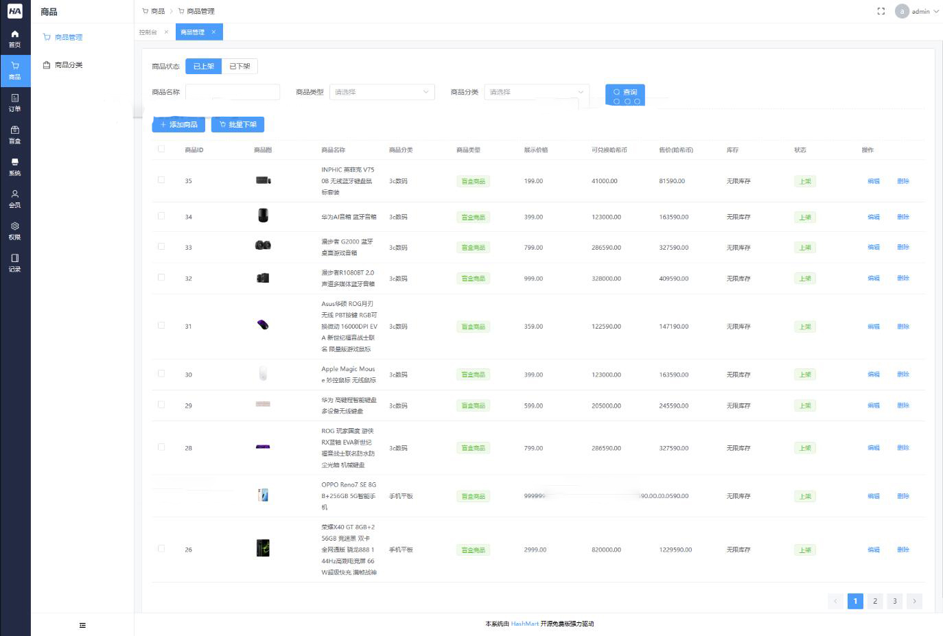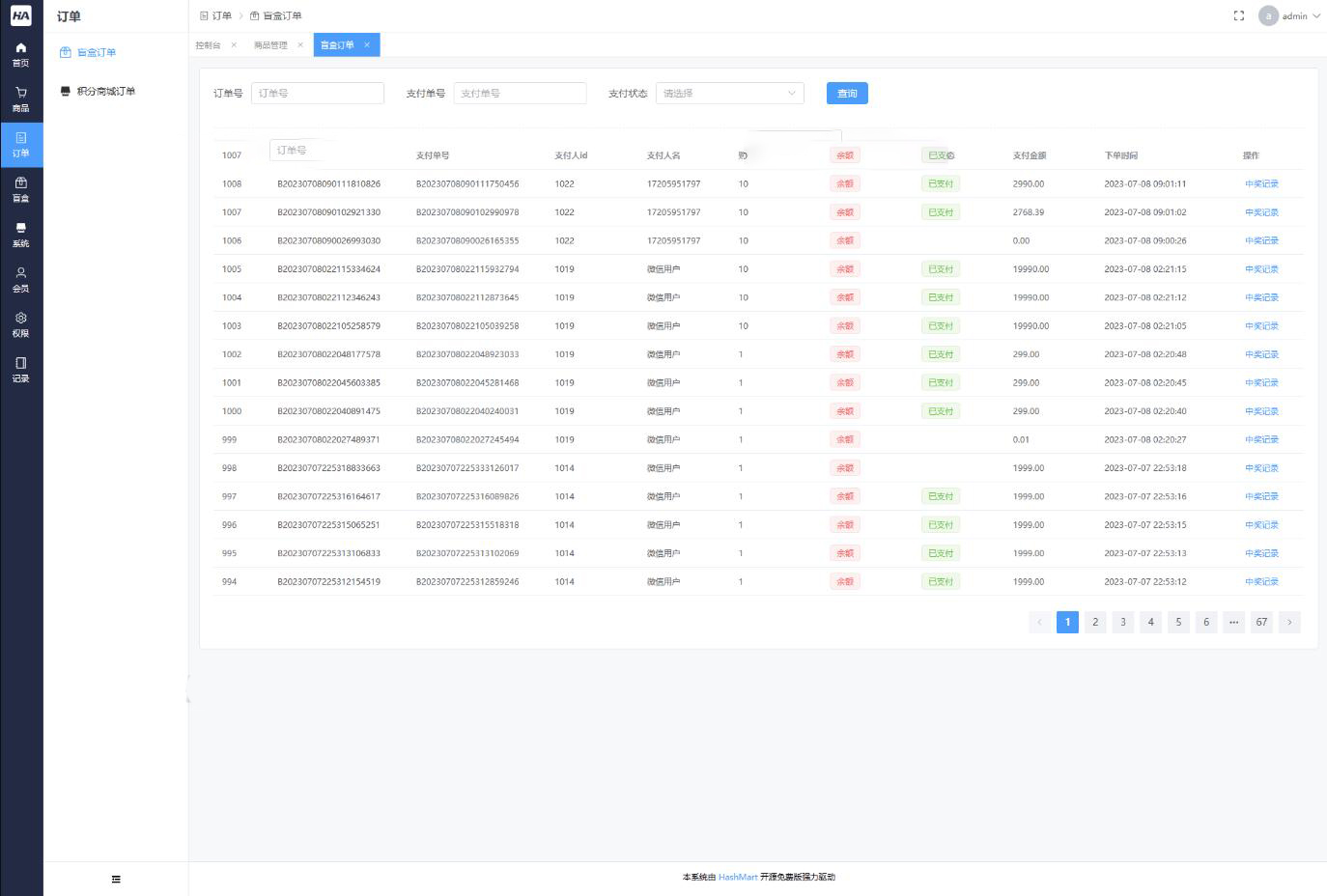 HashMart(哈希玛特)是首款开源的面向生产的高性能、易开发的盲盒系统。它包含:首页看板、商品管理、订单管理、盲盒管理、系统管理、会员管理、权限管理、记录管理,并且拥有完善的搭建使用手册和接口文档。是帮助您快速落地盲盒商城系统的不二之选。