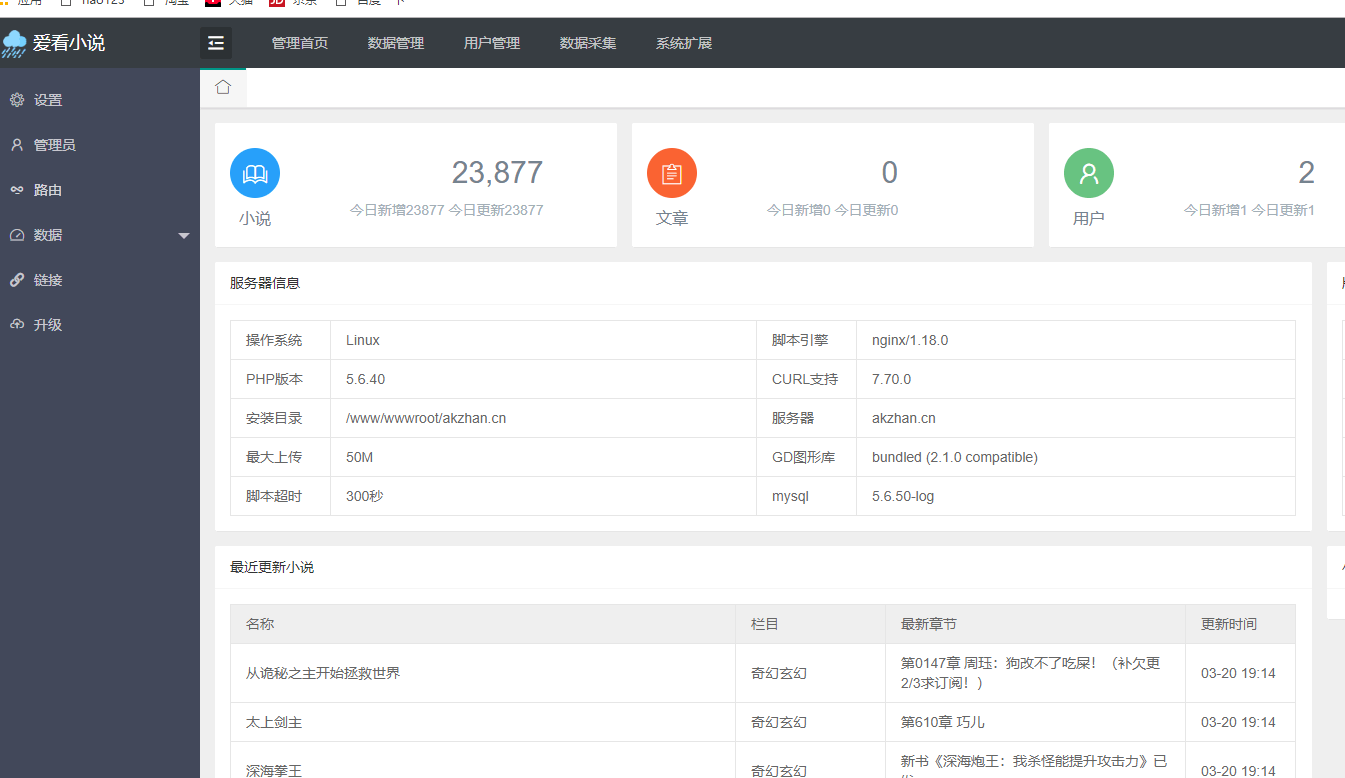 这套源码是狂雨小说系统二开的,数据库很大,几百M,据说里面带有几万套小说,但是很可惜,站长搭建没有成功,有能力的拿去研究,能导出里面的几万本小说也不错啊。本站有狂雨小说系统原版系统,测试可正常运行,如须要就自己找一下。