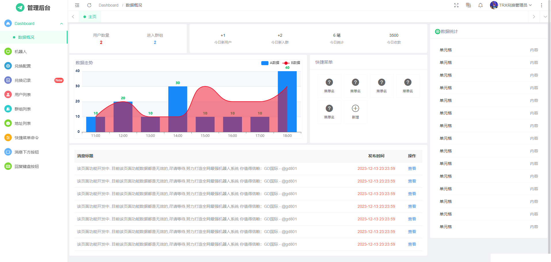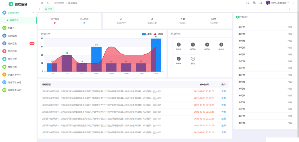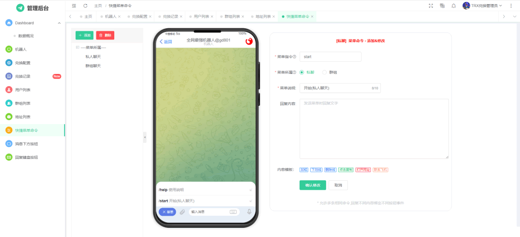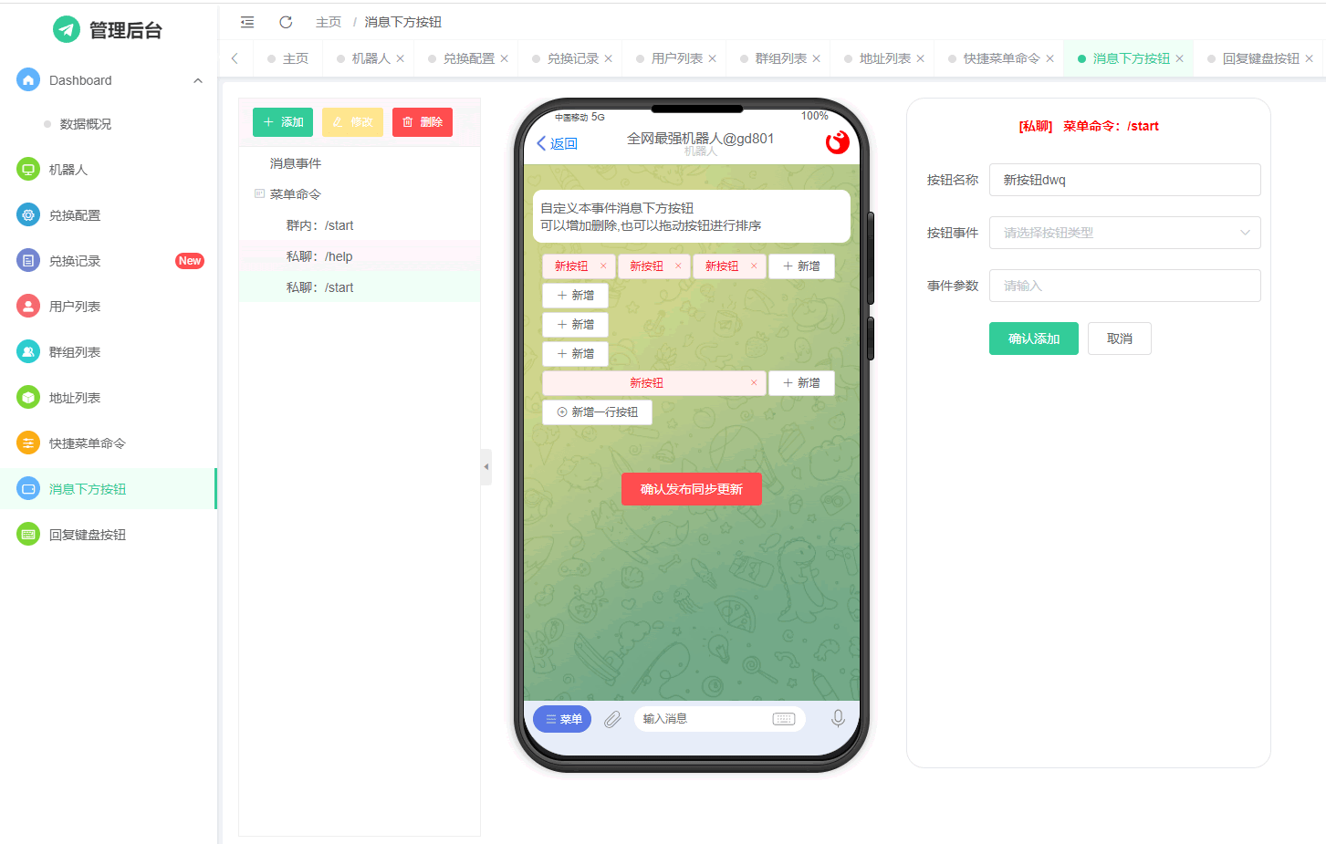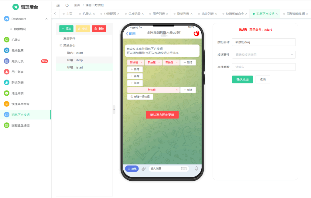 支持后台可视化自定义消息下发按钮 菜单命令 用户管理 群管理 推广返利等等