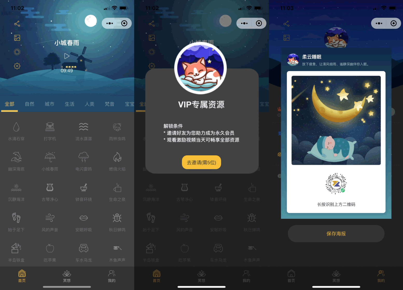 睡眠助手/白噪音/助眠夜曲微信小程序源码 附教程 支持分享海报 支持暗黑模式 包含了音频数据