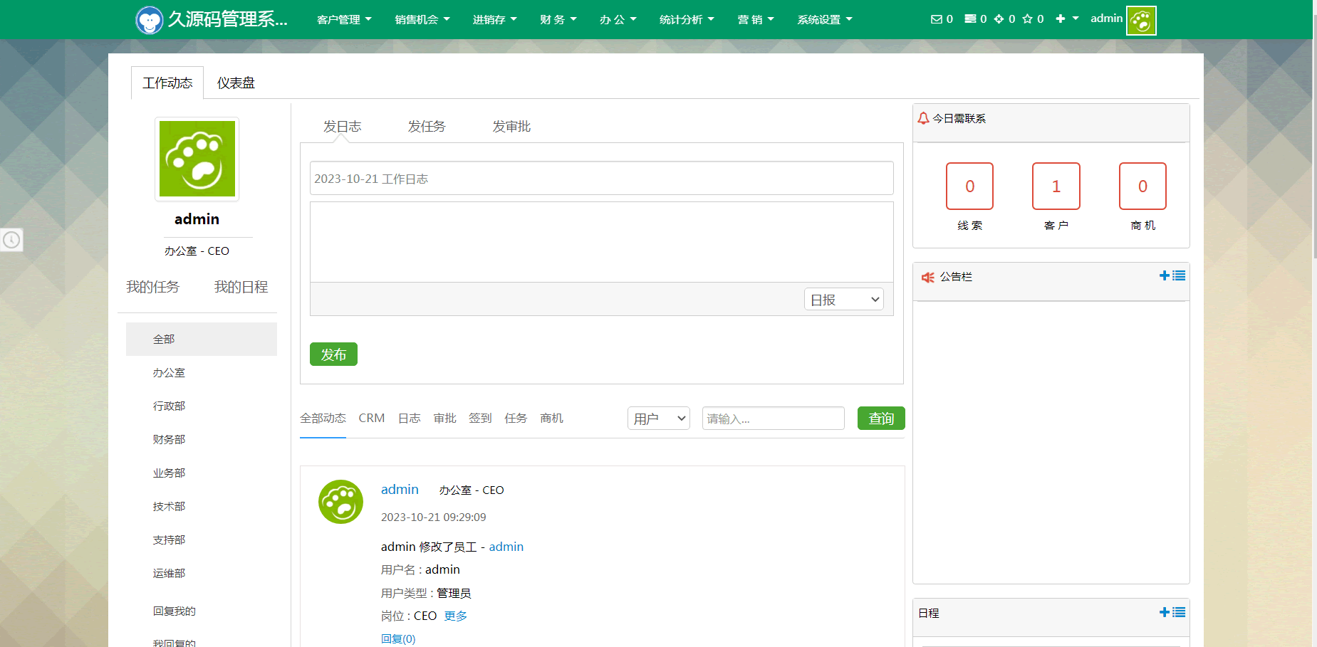 【优化】 1、权限问题:销售人员创建收款单,财务负责审核 2、停用用户,“审批统计”不显示 3、完成工单审核时,添加“评分、满意度” 备注等字段内容 4、按照部门创建知识,进行查看知识分类处设置 5、审批、任务进度状态颜色优化 6、组织架构效果优化 7、线索、客户、商机列表页下次联系时间、下次联系内容效果的优化 8、审批信息推送内容的优化 9、优化标签、最新动态等UI效果