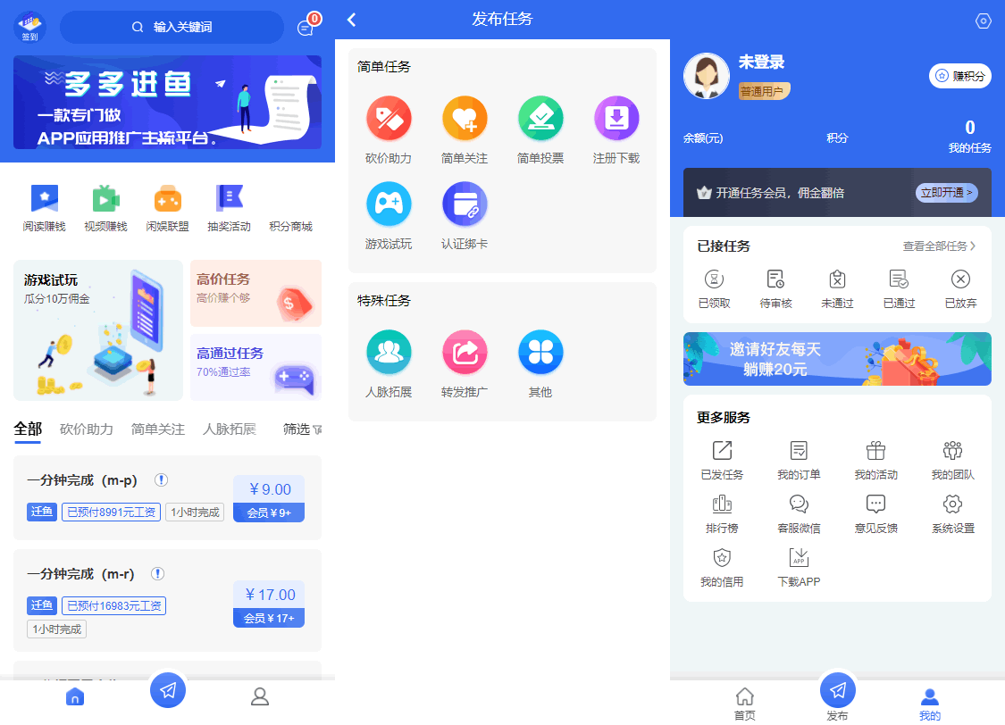 任务管理:包含平台的任务列表和用户任务列表,以及任务订单的相关管理。