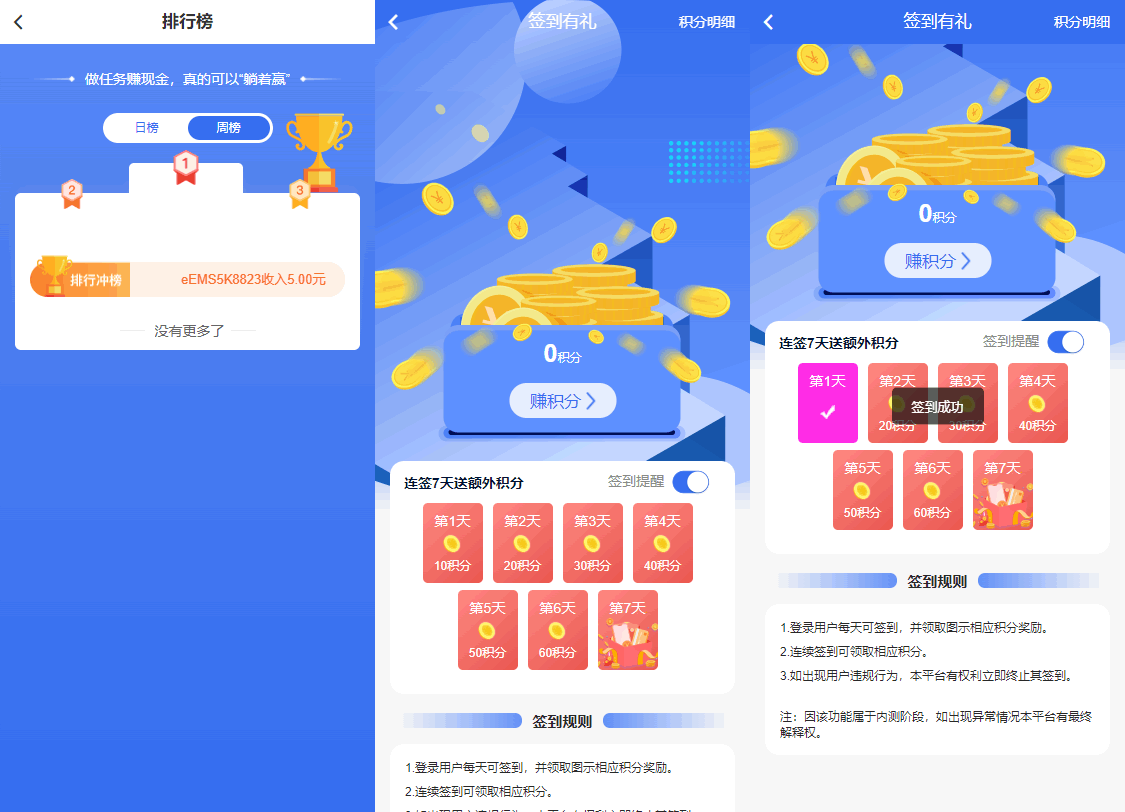 积分商城:赚积分可在商城里兑换平台的一些礼品等,提高了用户粘性,为平台增加了更多的亮点。
