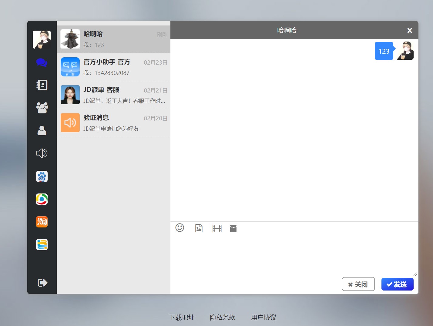 后台可以设置禁止发送或者屏蔽的关键词 内置浏览器可自动提取并打开超链接,单一的超链接可以提取到标题和简介, 消息记录支持服务器同步、支持pc和移动端同时登录,并接收消息 可以设置免打扰、置顶,可以手动删除。  |