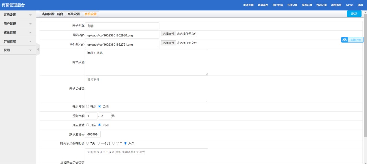 | 群组 | 显示群聊信息、群聊二维码、管理员权限,可禁言可撤回消息,可全局禁言也可单独禁言,可设置用是否可以查看用户信息,